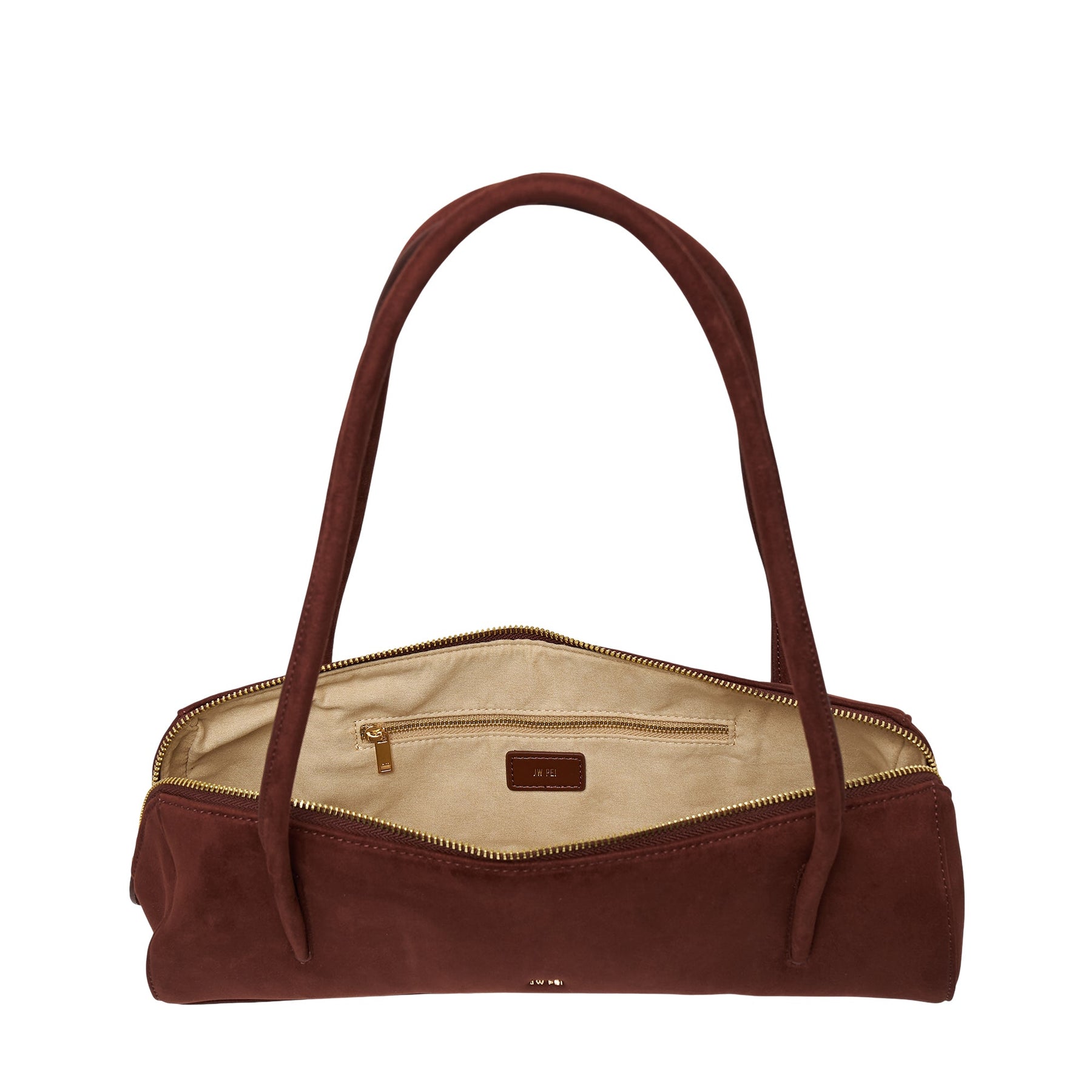 The JW PEI Nova Shoulder Bag delivers contemporary elegance with structured minimalist design and versatile functionality. Crafted from premium suede leather in rich chocolate brown, featuring dual top handles and secure zip closure with gold-tone hardware. The compact rectangular silhouette and clean lines create a timeless accessory that transitions seamlessly from day to evening.