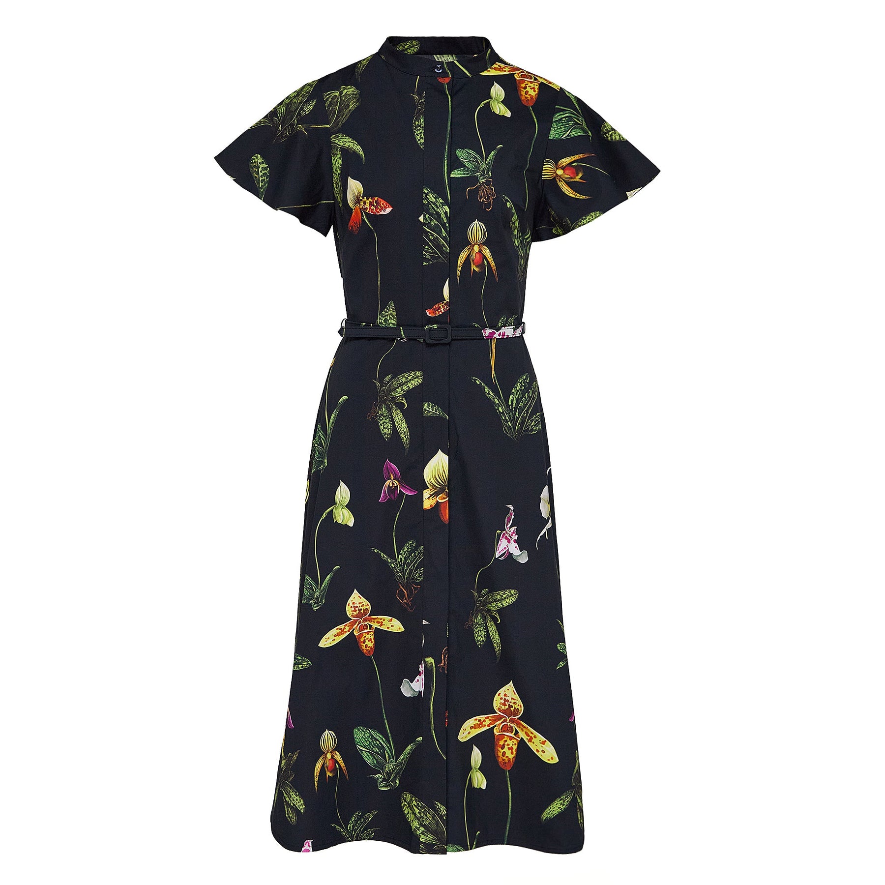 Orchids blossom in full upon this caftan. Crafted from cotton poplin in a soft shade of blue, this piece is complete with a concealed button front and voluminous, short sleeves.