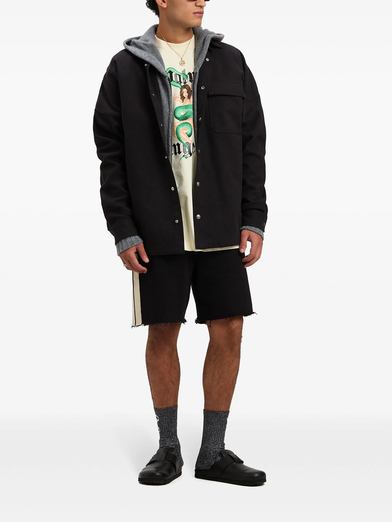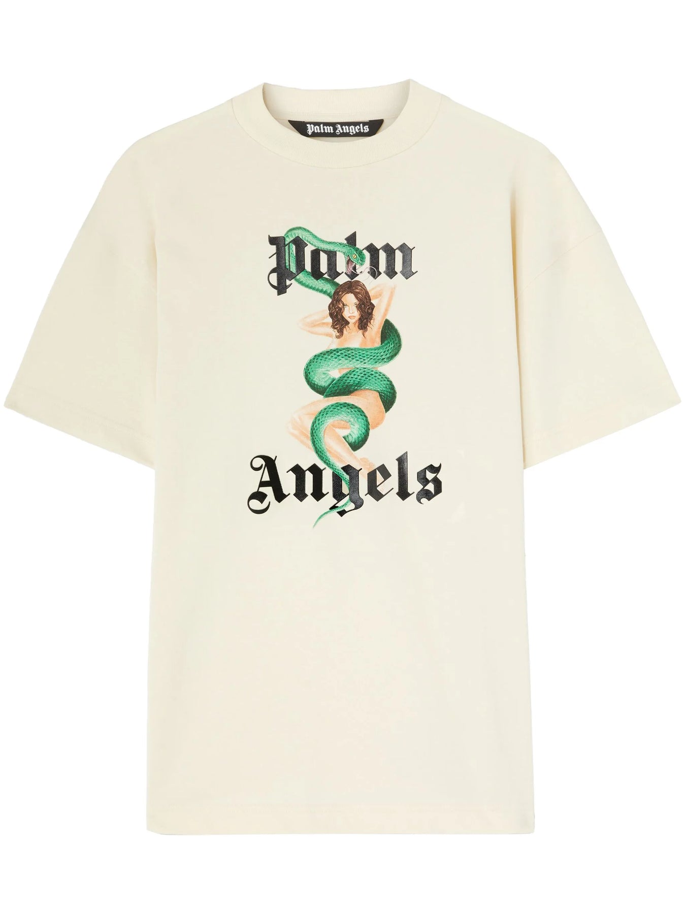 A unique print inspired by vintage pin-ups, hybridized with elements from Palm Angels world. Men's ivory-colored short-sleeved T-shirt with image of pin up wrapped in snake spirals and Palm Angels logo printed in black.