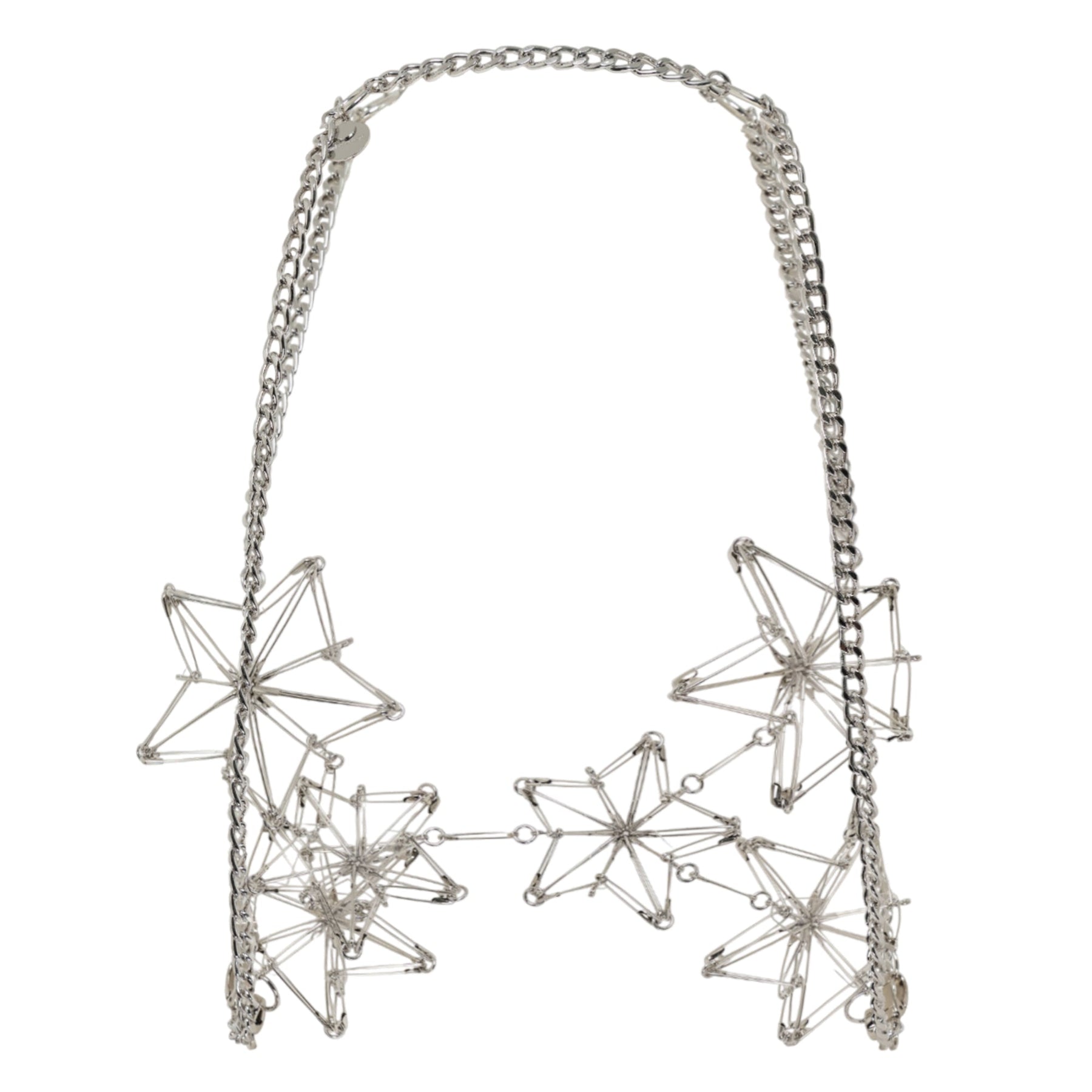 Noir Kei Ninomiya Pin x Chain delivers avant-garde jewelry design with architectural construction and sculptural appeal. Crafted from silver-toned metal featuring geometric star-shaped pendants connected by layered chain construction. The dramatic silhouette and signature Noir Kei Ninomiya aesthetic create a bold statement piece for contemporary styling.