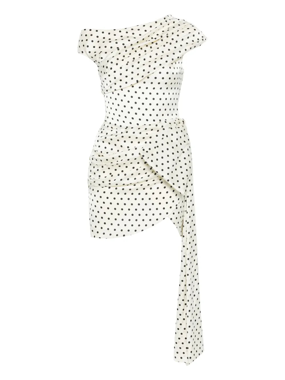 Self-Portrait Polka Dot Satin Tie Side Mini delivers contemporary femininity with playful sophistication and flattering construction. Crafted from luxurious satin in ivory with classic black polka dots, featuring an elegant cowl neckline and asymmetric tie-side detail. The figure-hugging silhouette and signature Self-Portrait romantic aesthetic create a statement piece for special occasions.