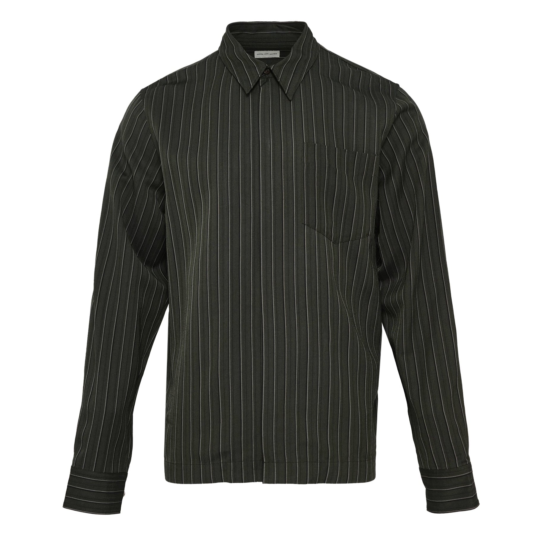 The Dries Van Noten Regular Fit Hidden Zip Shirt delivers contemporary tailoring with innovative closure design and signature pinstripe detailing. Crafted from premium cotton blend in sophisticated olive green with subtle white pinstripes, featuring a concealed zip front for modern minimalism. The regular fit and structured construction create a versatile piece that bridges formal and casual wardrobes.