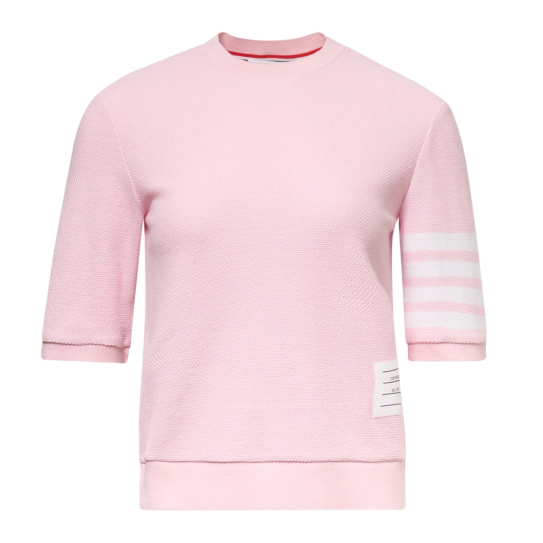 Thom Browne Rib Cuff Tee delivers elevated casual luxury with signature architectural construction and refined tailoring details. Crafted from premium textured pique cotton in soft pink, featuring ribbed cuffs and collar with contrast striped detailing on the sleeve. The structured silhouette and signature 4-bar stripe accent create a sophisticated approach to contemporary casual wear.