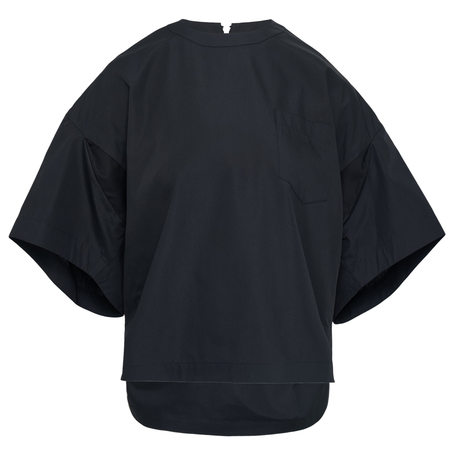 The sacai Poplin Pullover delivers contemporary sophistication with innovative design elements and precise construction. Crafted from crisp cotton poplin in classic black, featuring the brand's signature architectural silhouette with structured shoulders and relaxed fit. The minimalist aesthetic and premium fabric hand create a versatile statement piece that bridges casual and refined styling.