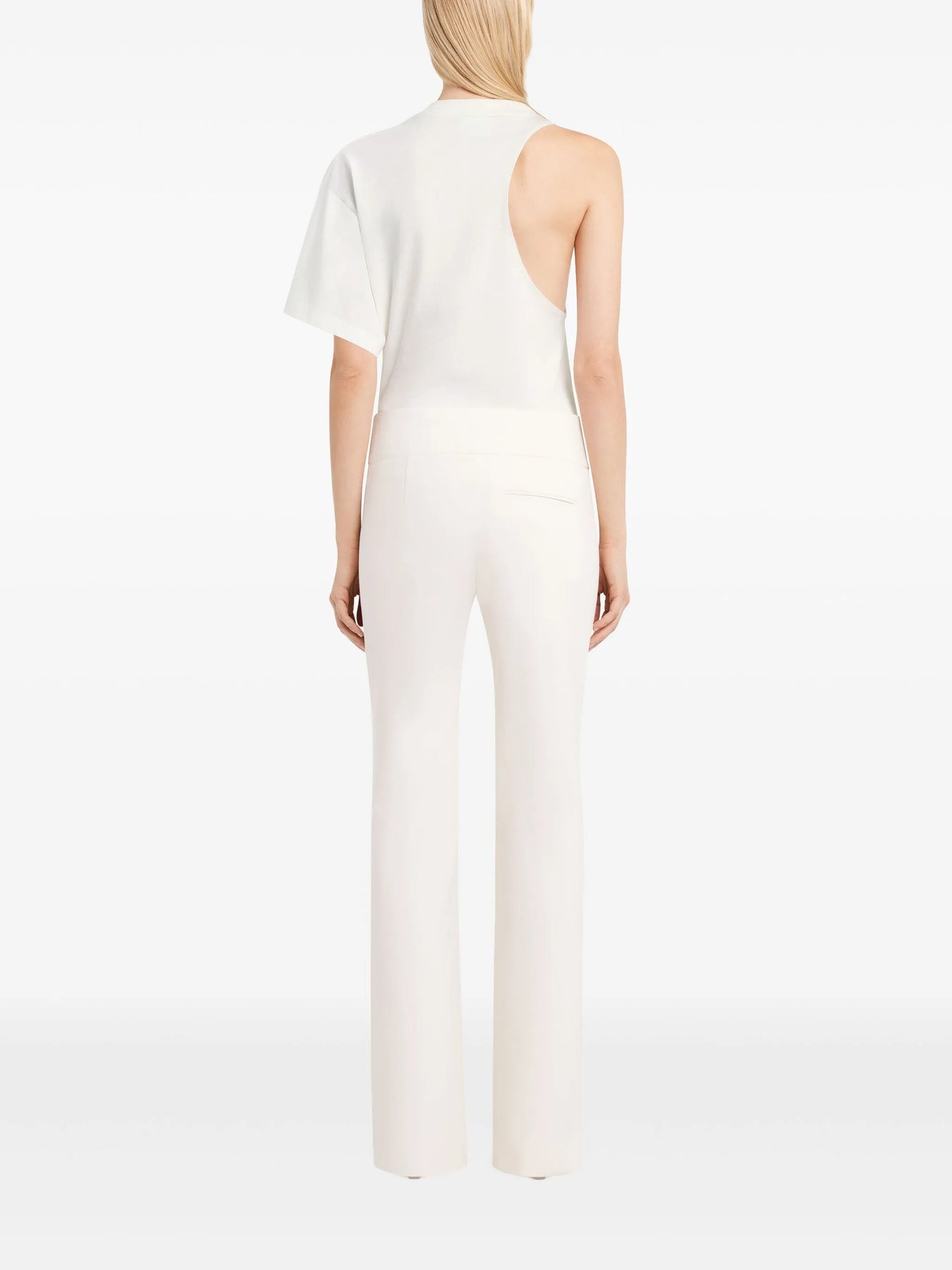Courrèges Scuba One-Sleeve T-Shirt delivers avant-garde asymmetrical design with futuristic minimalism. Crafted from structured scuba fabric in crisp white, featuring the brand's signature architectural approach to contemporary fashion. The distinctive one-shoulder construction creates a bold statement piece that embodies Courrèges' space-age aesthetic.