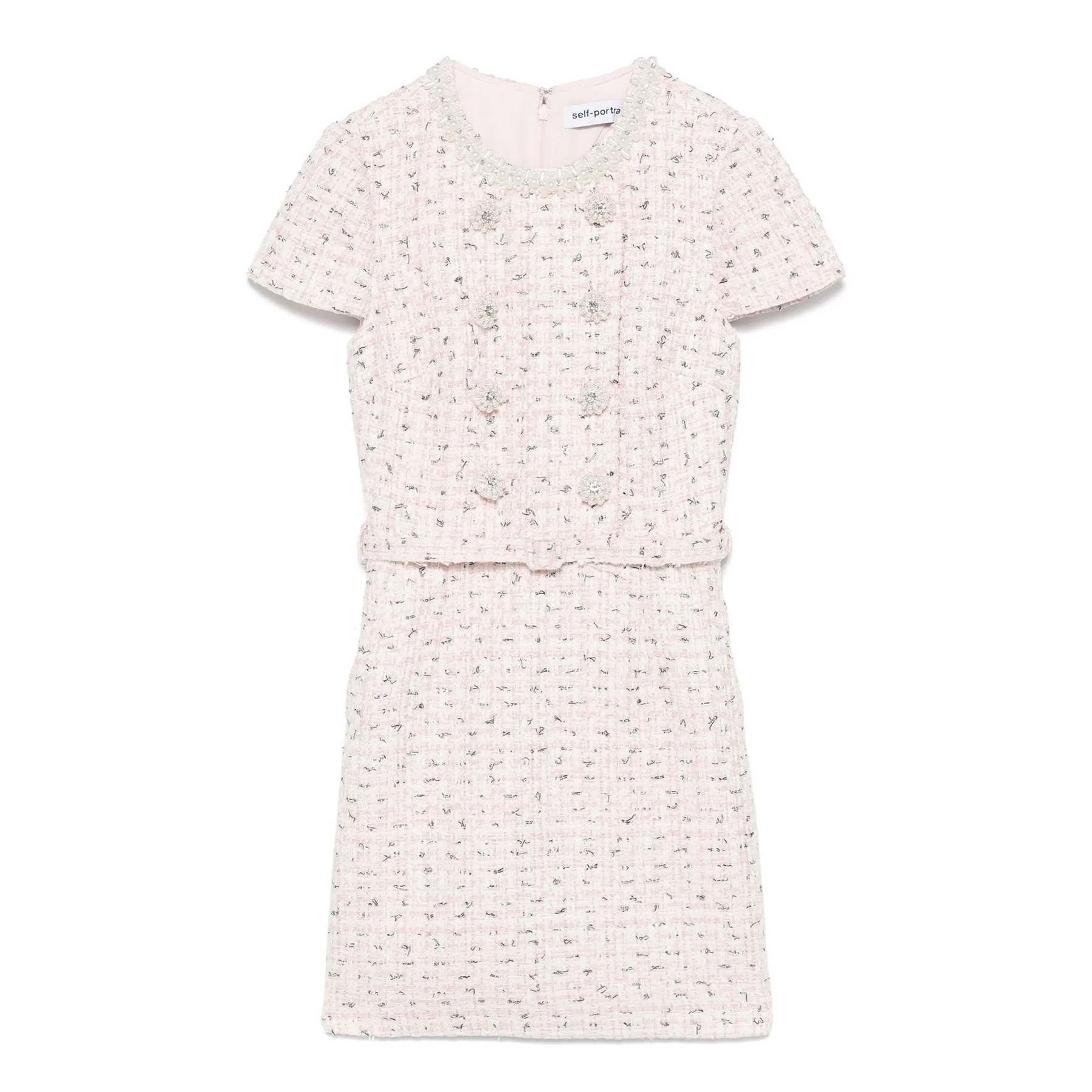 Classically chic, this pink boucle mini dress is belted at the waist and fitted to flatter the form. Pearl trims and diamante buttons add stylish detail - wear with flats for meetings that matter.