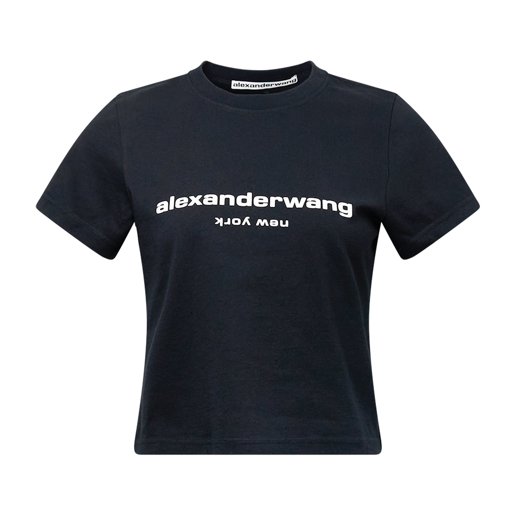 The Alexander Wang Shrunken Tee delivers contemporary streetwear with signature logo detailing and modern cropped proportions. Crafted from premium soft cotton in classic black, featuring raised white puff logo text across the chest. The deliberately shortened silhouette and oversized logo create an instantly recognizable piece for urban wardrobes.