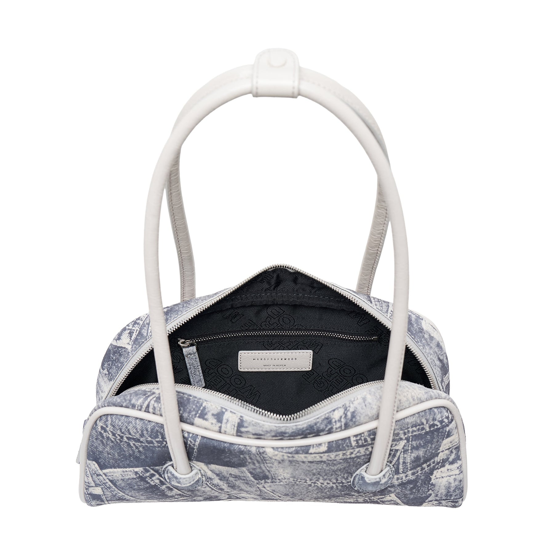 The MARGESHERWOOD Soft Boston EW Piping delivers contemporary luxury with artistic denim-inspired construction and structured elegance. Crafted from premium materials featuring a unique distressed denim print effect with contrasting white piping throughout. The East-West silhouette and signature MARGESHERWOOD aesthetic create a statement piece that bridges streetwear and luxury accessories.