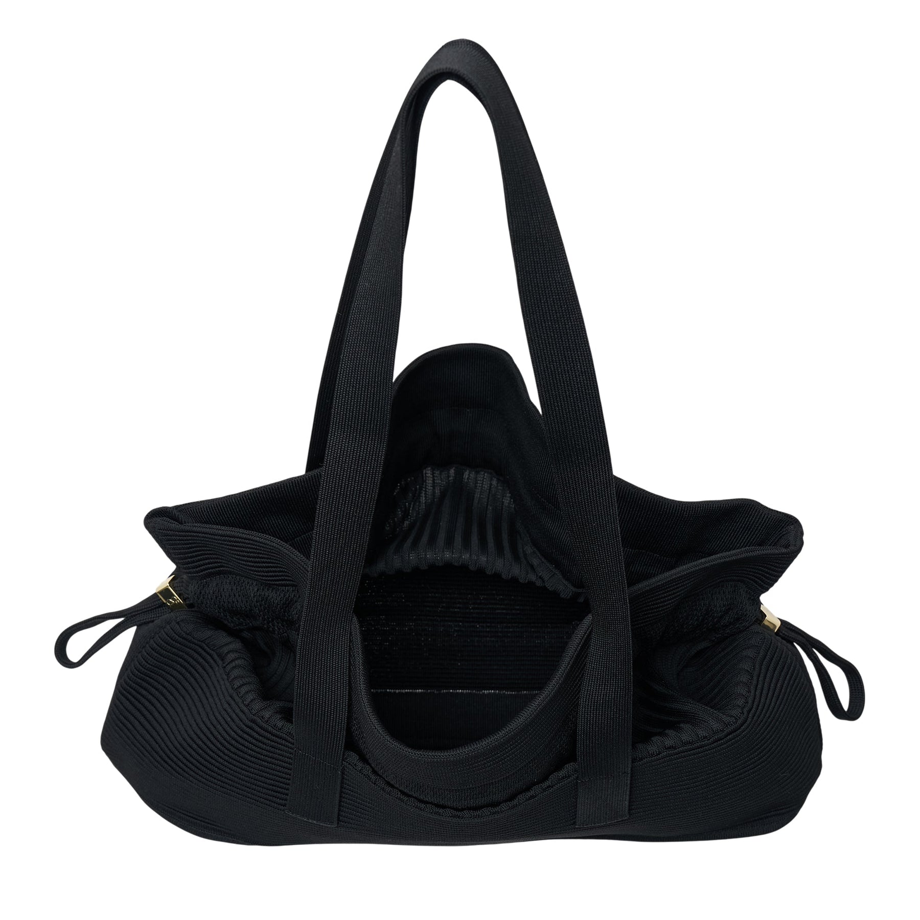 The CFCL Stratum Elongated Bag delivers innovative Japanese design with architectural construction and versatile functionality. Crafted from technical ribbed fabric in sophisticated black, featuring a structured pleated silhouette that expands and contracts for dynamic storage. The signature CFCL engineering creates a sculptural accessory that adapts to modern lifestyle needs.