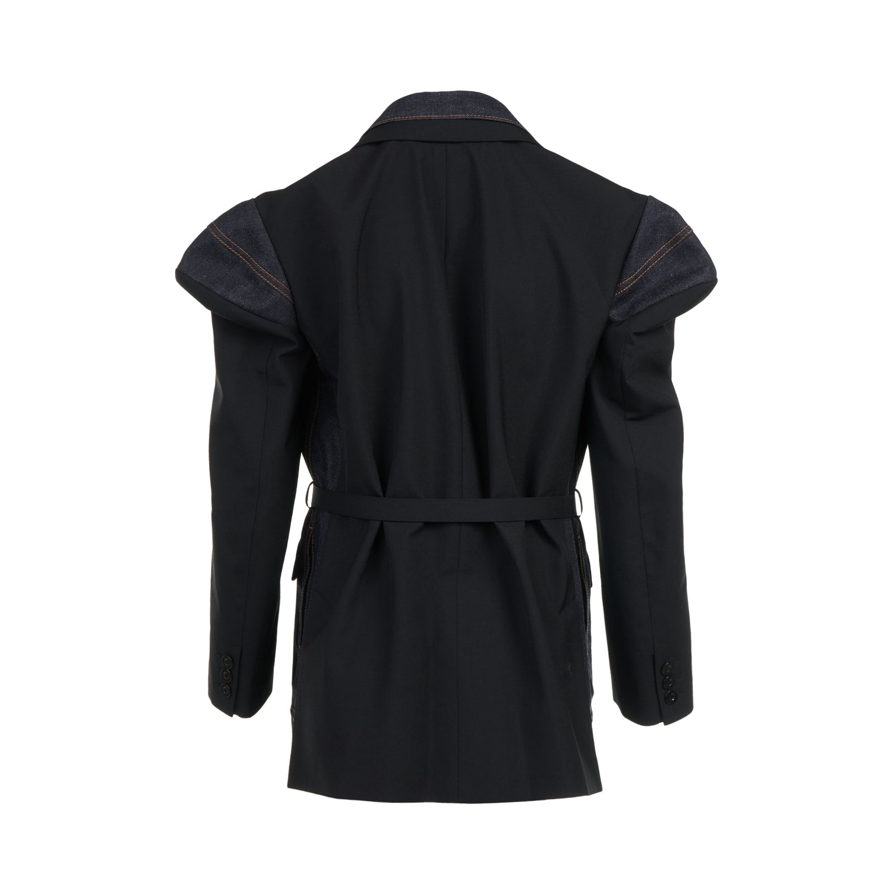 The sacai Suiting x Denim Jacket delivers hybrid design innovation with the brand's signature fabric mixing approach. Constructed with structured black wool suiting fabric layered over indigo denim, featuring contrast topstitching and deconstructed tailoring elements. The multi-layered construction and belt detailing create sacai's distinctive avant-garde silhouette.