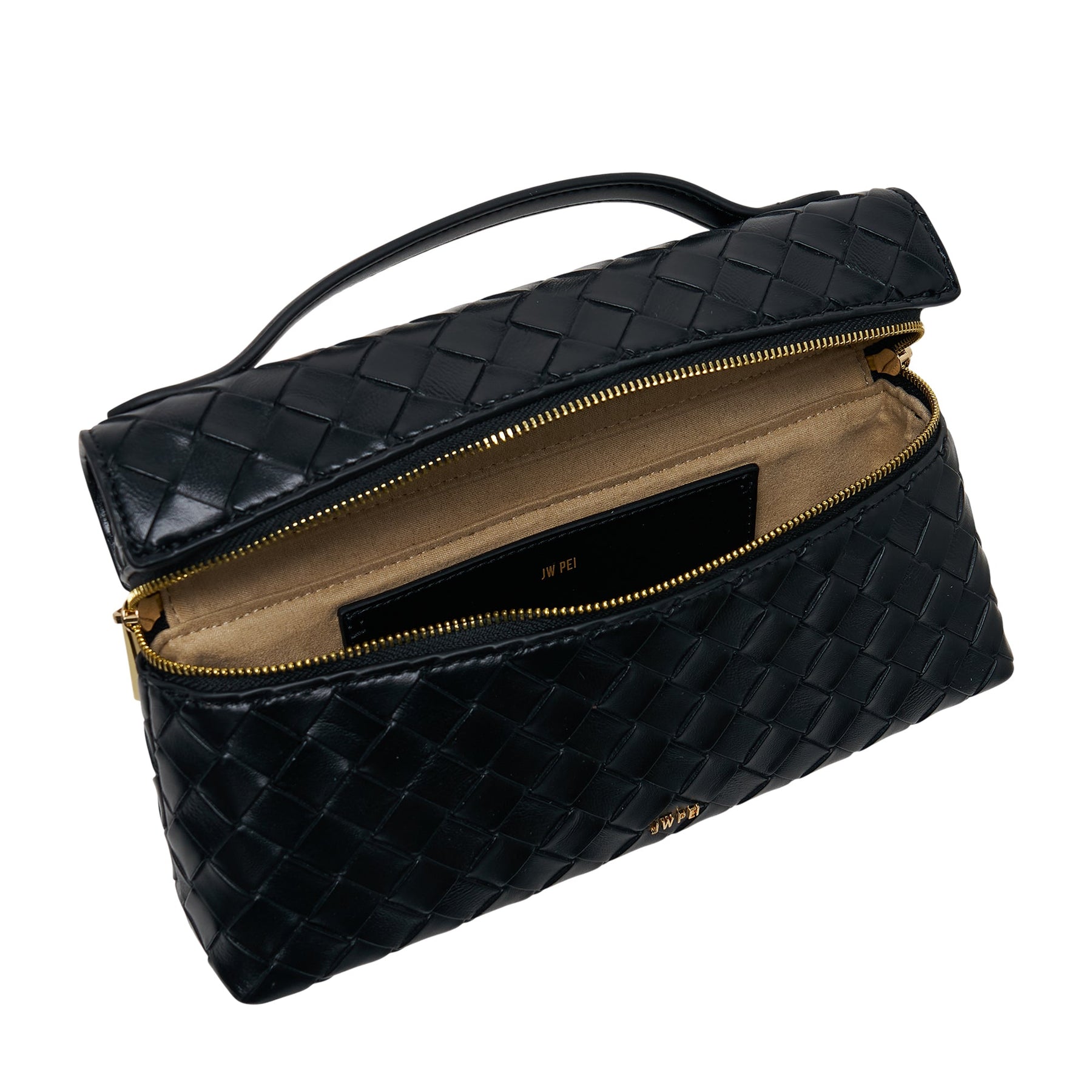 The JW PEI Thea Weave Texture Top Handle delivers structured elegance with contemporary woven craftsmanship. Crafted from premium intricately woven black leather featuring a distinctive basket-weave pattern and dual gold-tone zipper closure. The compact vanity case silhouette and top handle design create a sophisticated accessory for modern beauty essentials.