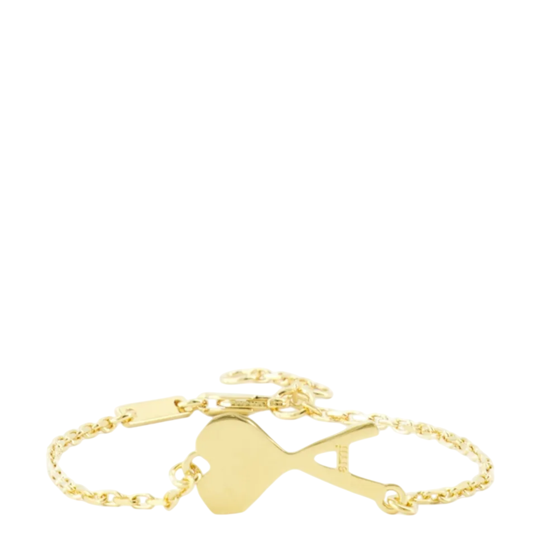 The AMI Thin Hammered Ami De Coeur Bracelet delivers understated Parisian elegance with the brand's iconic heart symbol. Crafted from delicate gold-tone metal with a fine chain construction and signature Ami de Coeur charm centerpiece. The minimalist design and refined hammered texture create a versatile accessory perfect for daily wear or special occasions.