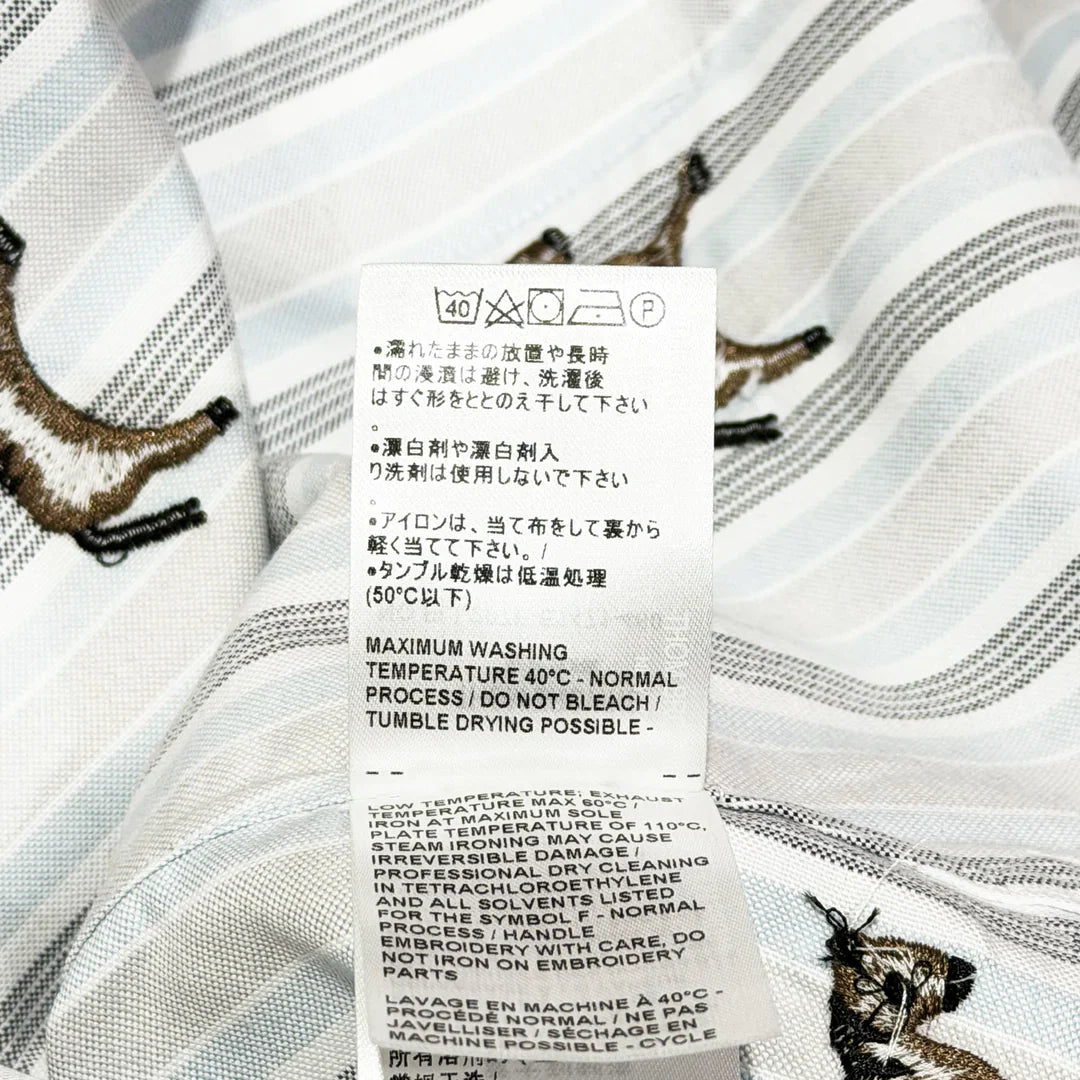 The Thom Browne Classic Round Collar Shirt delivers signature preppy sophistication with distinctive embroidered detailing. Crafted from premium cotton with fine gray pinstripes and playful horse motif embroidery throughout the fabric. The signature rounded Peter Pan collar and tailored construction create a refined yet whimsical statement piece.