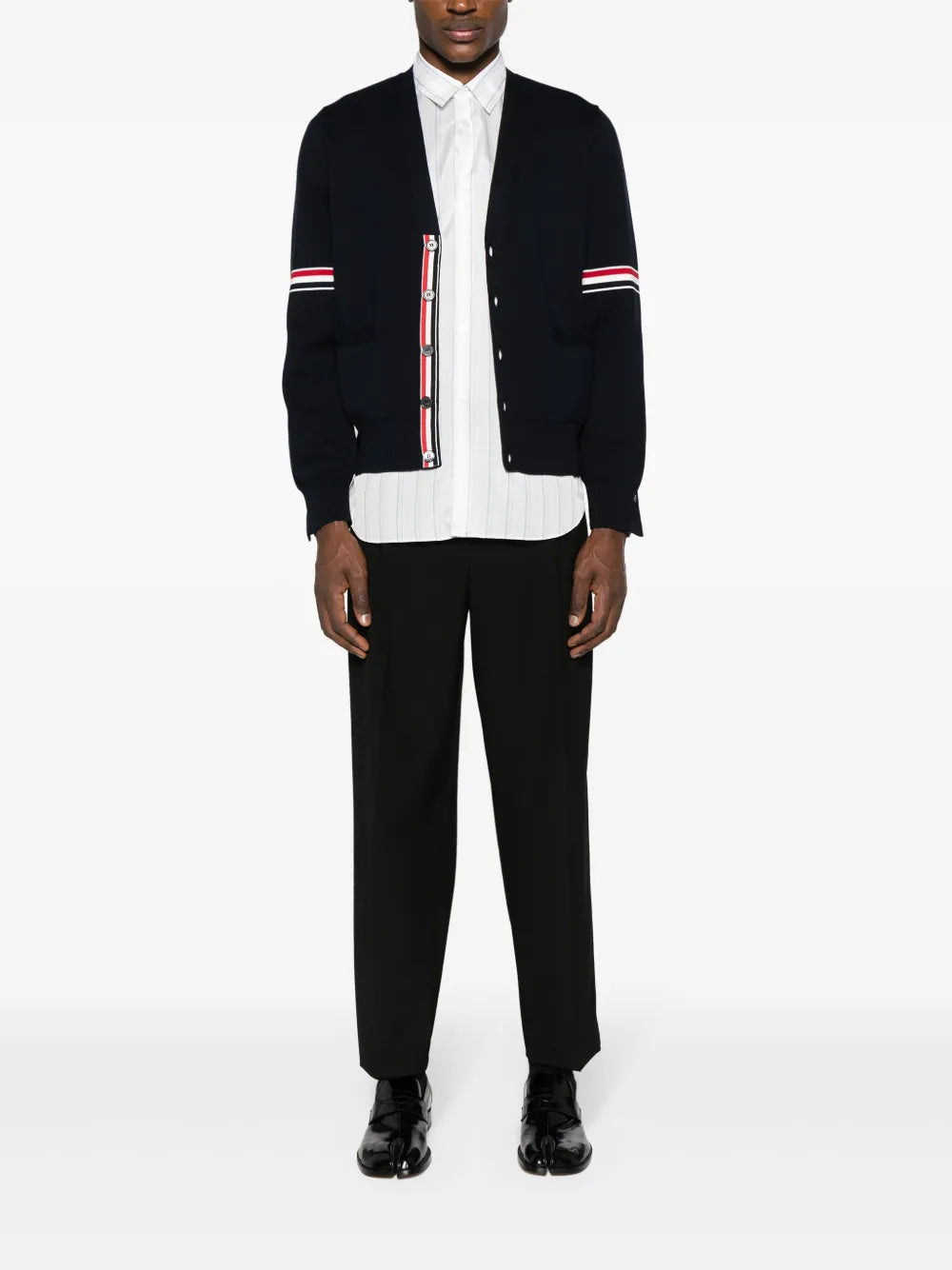 The Thom Browne Cotton Milano Stitch V-Neck Cardigan delivers American luxury with architectural tailoring and signature prep-school aesthetics. Crafted from premium Milano-stitch cotton in navy with distinctive varsity-inspired sleeve stripes in white, red, and black. The structured construction and iconic Thom Browne proportions create a sophisticated piece that bridges formal and casual wardrobes.