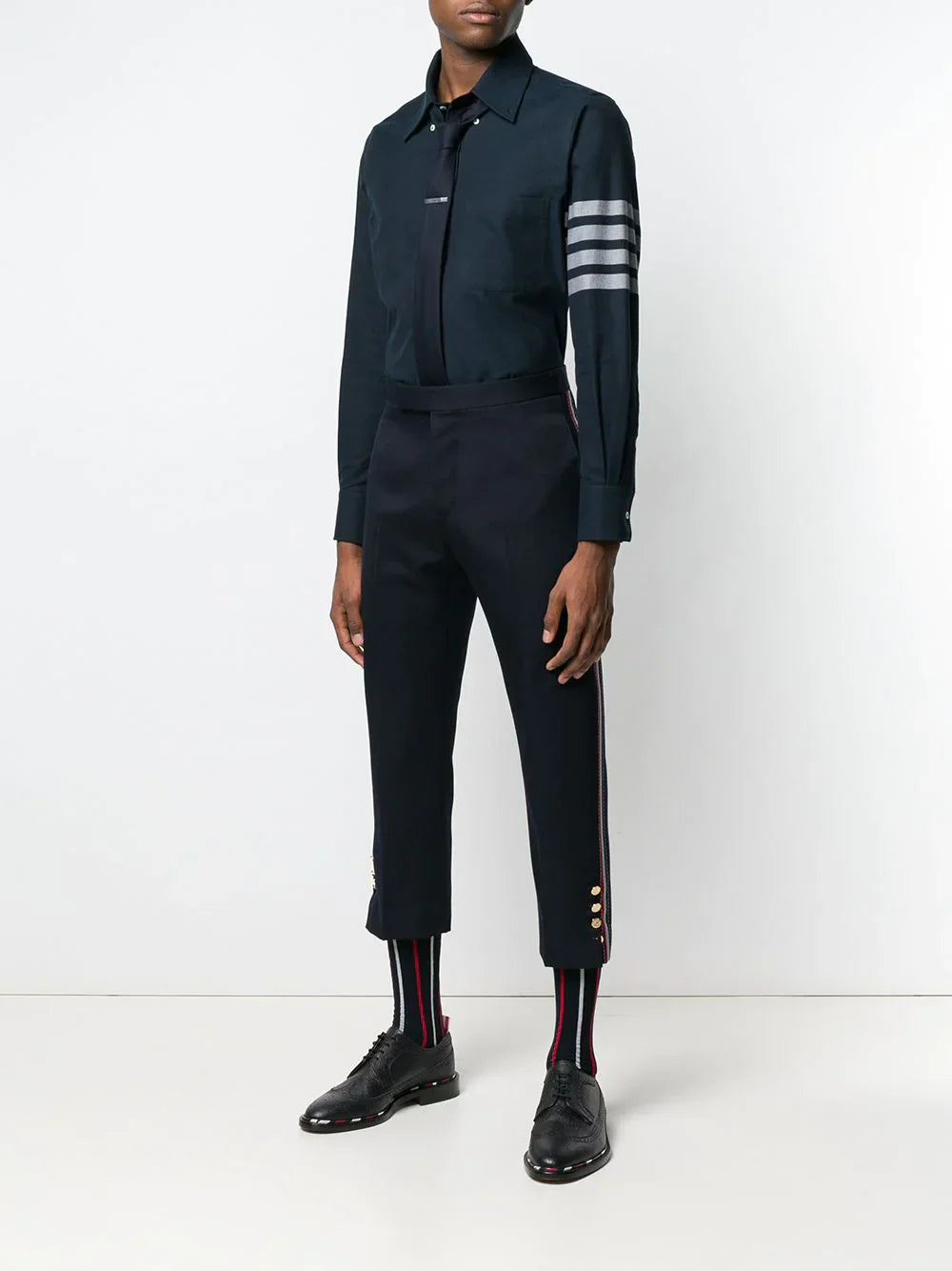 Thom Browne infuses its signature style into this navy long-sleeve shirt. The classic shirt takes on a new dimension with the addition of the signature 4-Bar stripe on the sleeve, complemented by the recognizable logo patch on the front. The signature grosgrain loop tab graces the rear of the design, providing a branded finish to this shirt.
