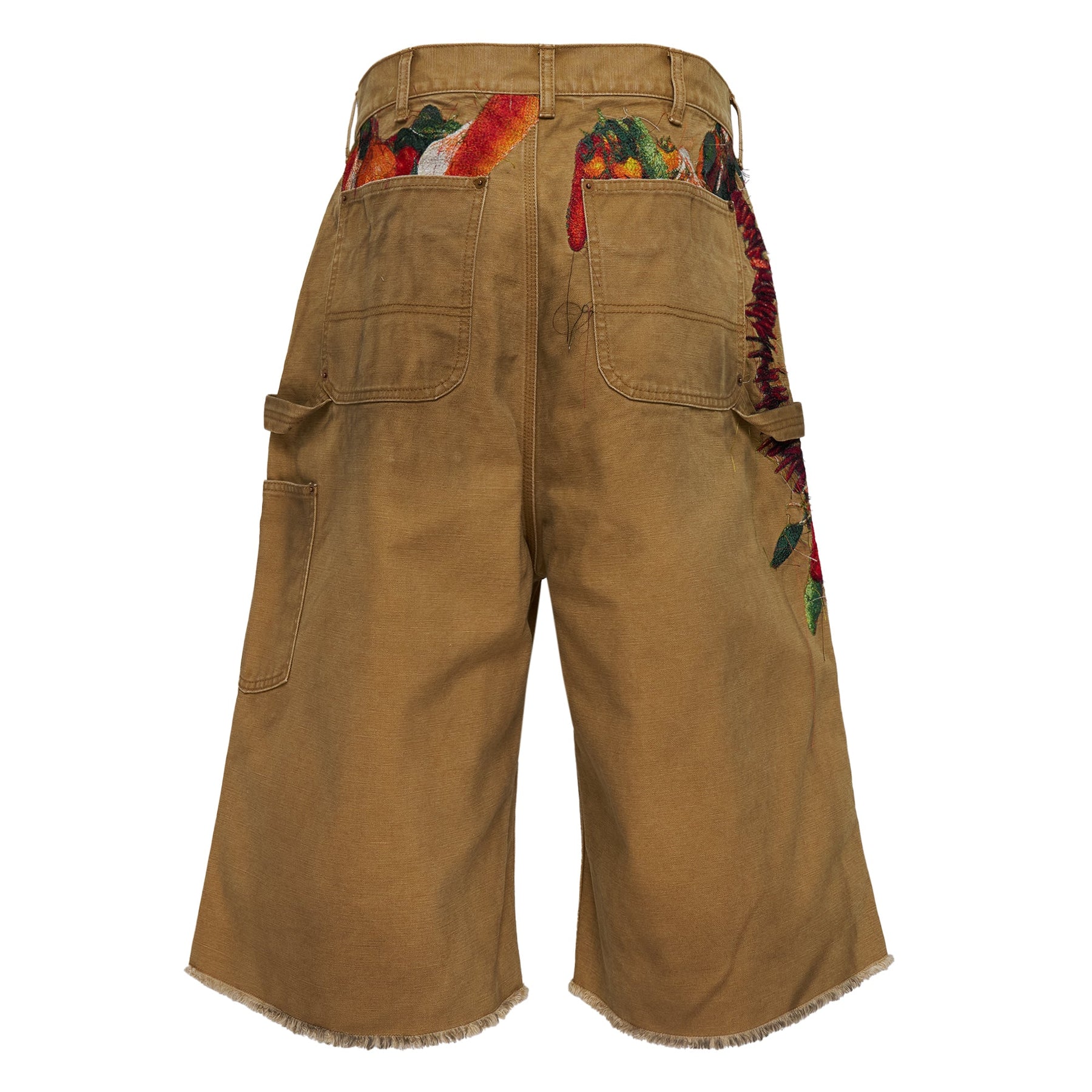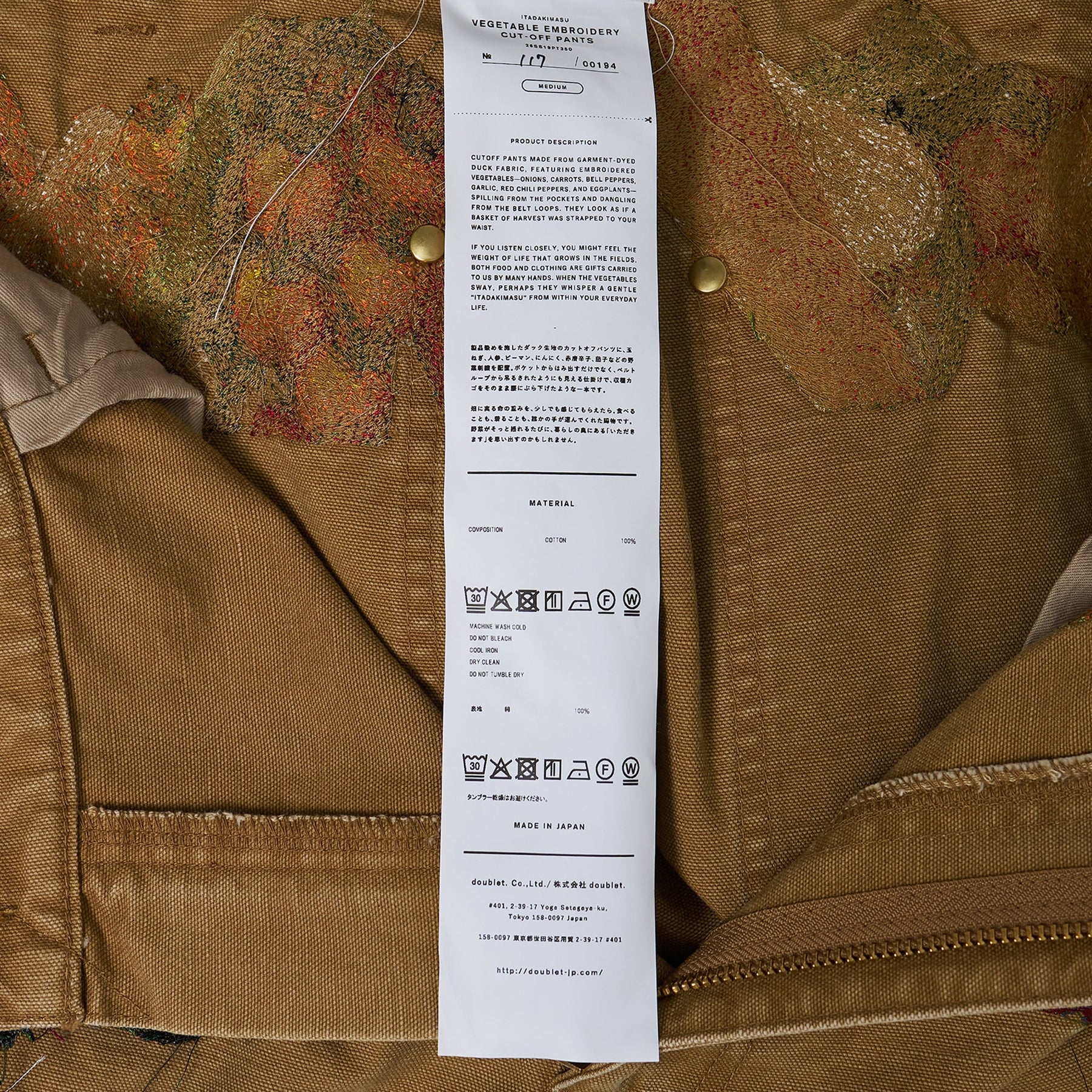 doublet Vegetable Embroidery Cut Off Pants deliver avant-garde Japanese design with intricate hand-embroidered detailing and contemporary streetwear silhouettes. Crafted from premium cotton twill in warm camel brown, featuring vibrant vegetable motifs including peppers and corn meticulously embroidered on each leg. The relaxed cut-off construction and raw hem edges create doublet's signature deconstructed aesthetic with artistic storytelling.