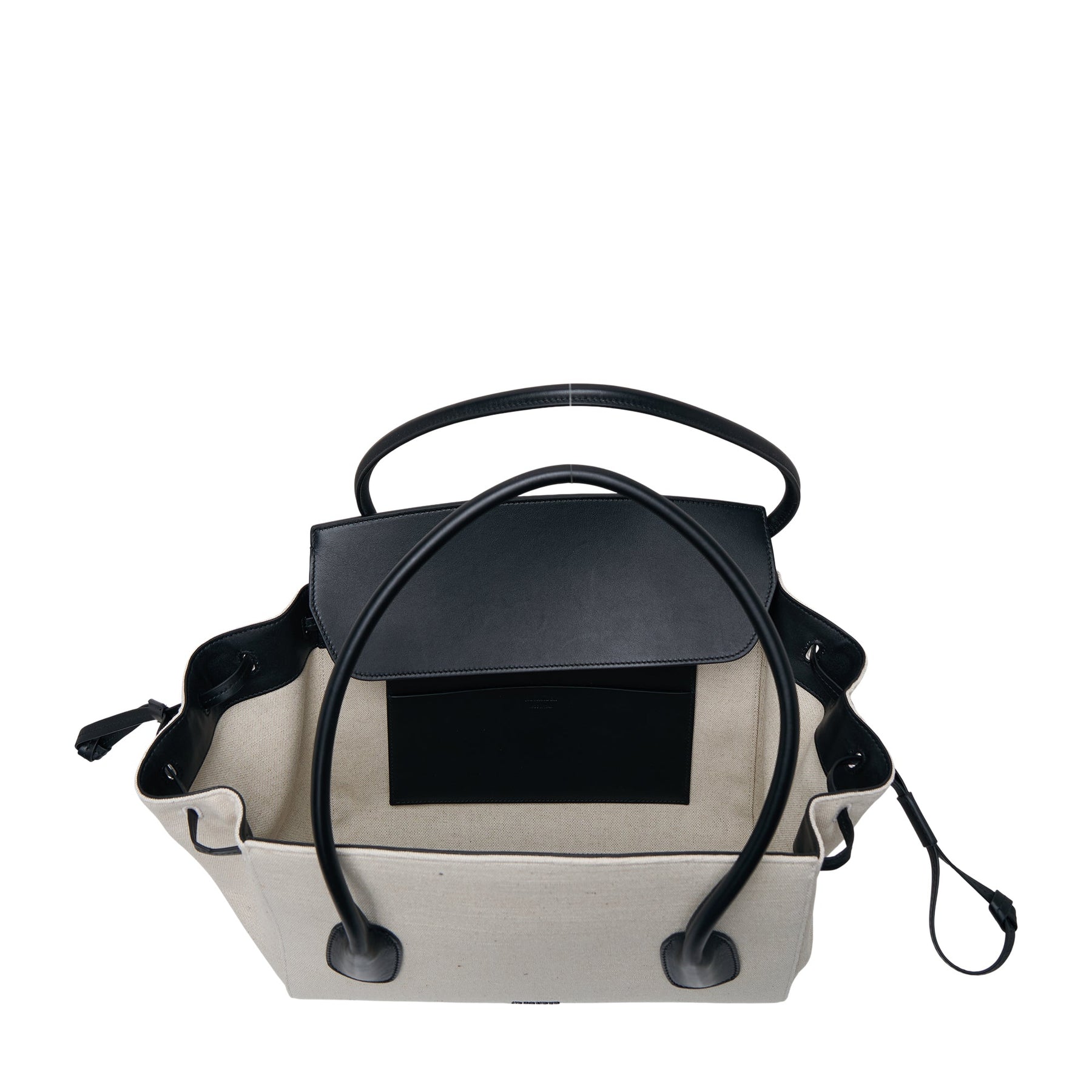 • Natural canvas body with black leather trim