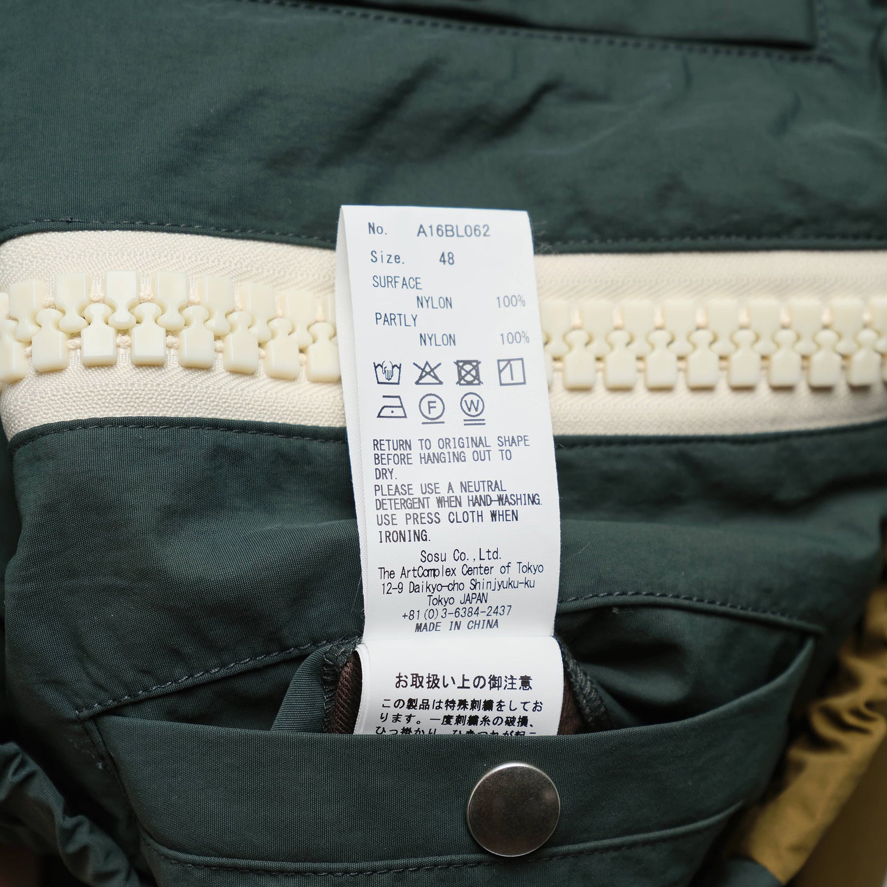 MIHARA YASUHIRO W Sleeve Nylon Jacket delivers contemporary streetwear with multi-panel construction and functional design. Crafted from technical nylon with colorblock paneling in forest green, beige, and white, featuring contrasting sleeve details and adjustable hood. The oversized silhouette and signature MIHARA YASUHIRO aesthetic create a statement piece for urban wardrobes.