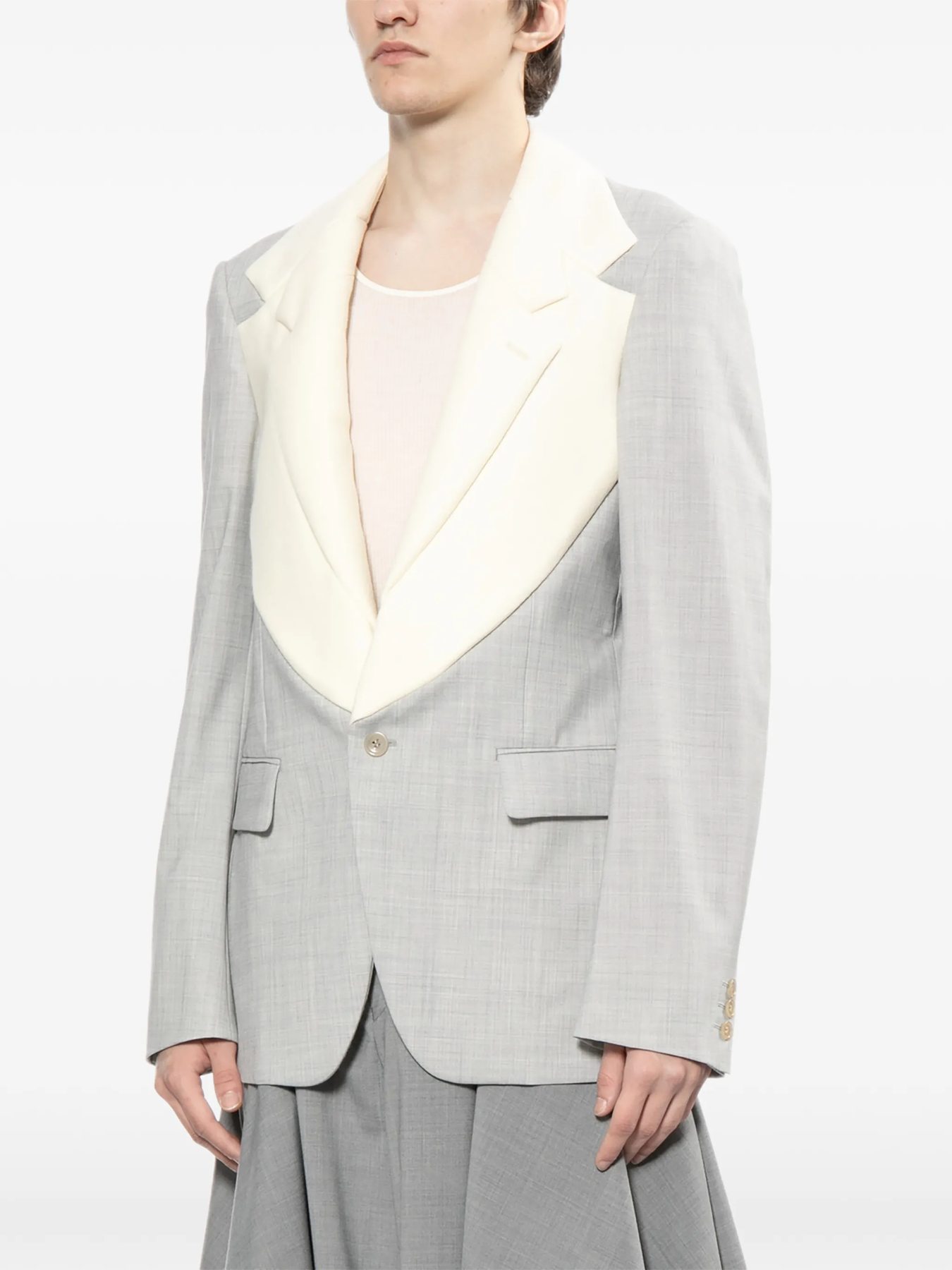The COMME des GARCONS HOMME PLUS Wool Blend Jacket delivers avant-garde sophistication with architectural tailoring and contemporary contrast design. Crafted from premium wool blend fabric in grey with contrasting cream lapels, featuring the brand's signature deconstructed aesthetic. The oversized lapel construction and asymmetrical color blocking create a bold statement piece that redefines formal menswear.