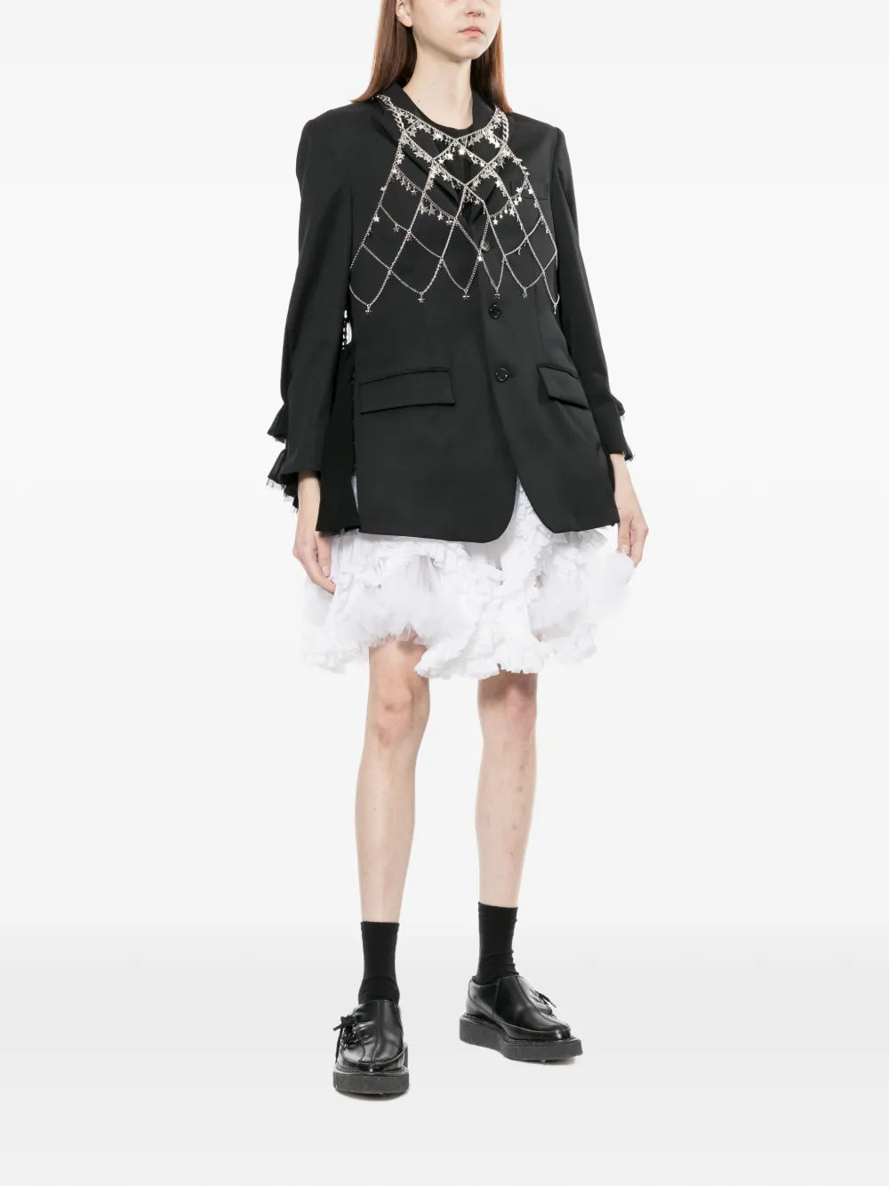 Noir Kei Ninomiya Wool Gabardine x Polyester Geo delivers avant-garde tailoring with innovative fabric manipulation and architectural construction. Crafted from premium wool gabardine blended with geometric polyester panels, featuring distinctive textural contrasts and structured silhouette. The experimental design showcases Ninomiya's signature approach to deconstructed formal wear with contemporary edge.
