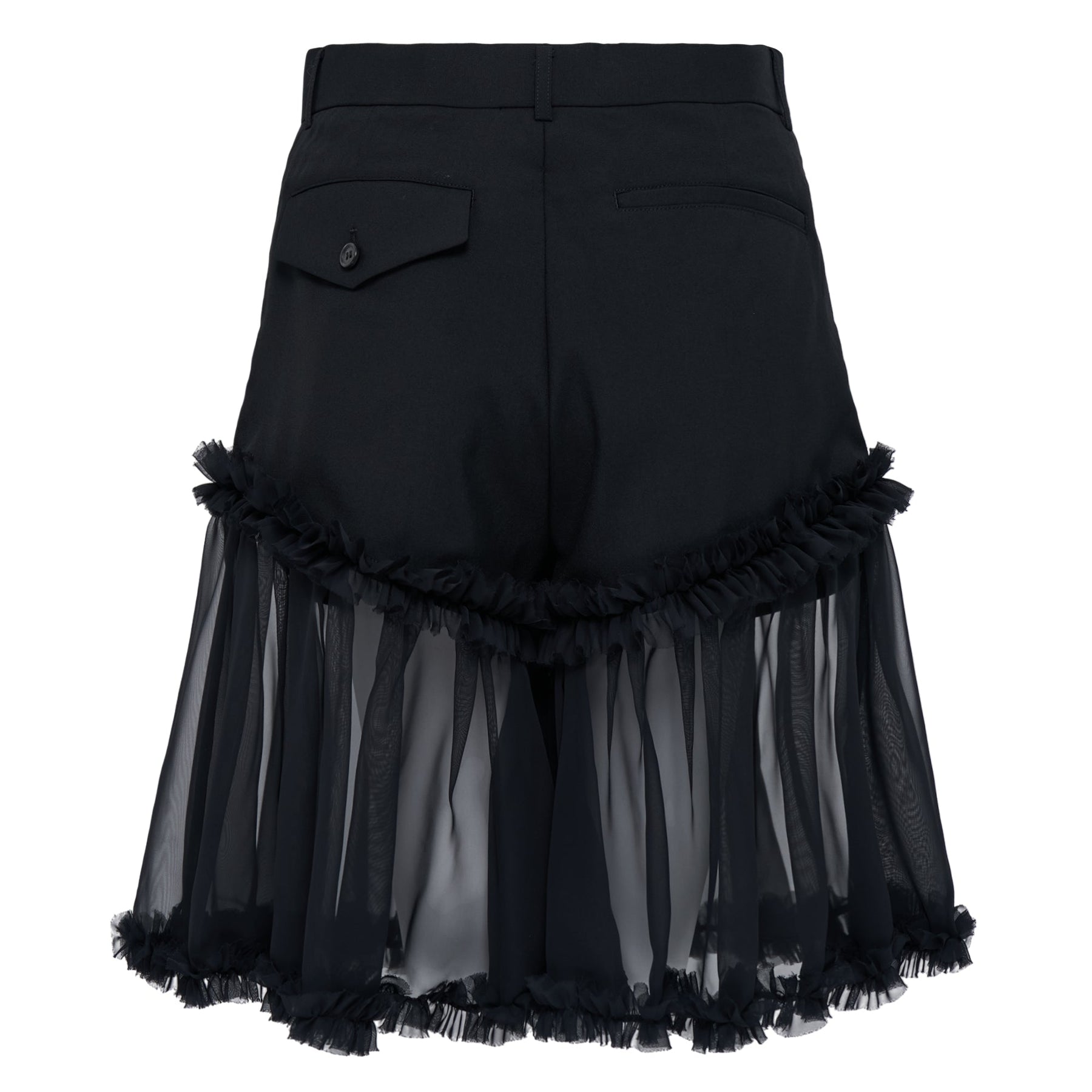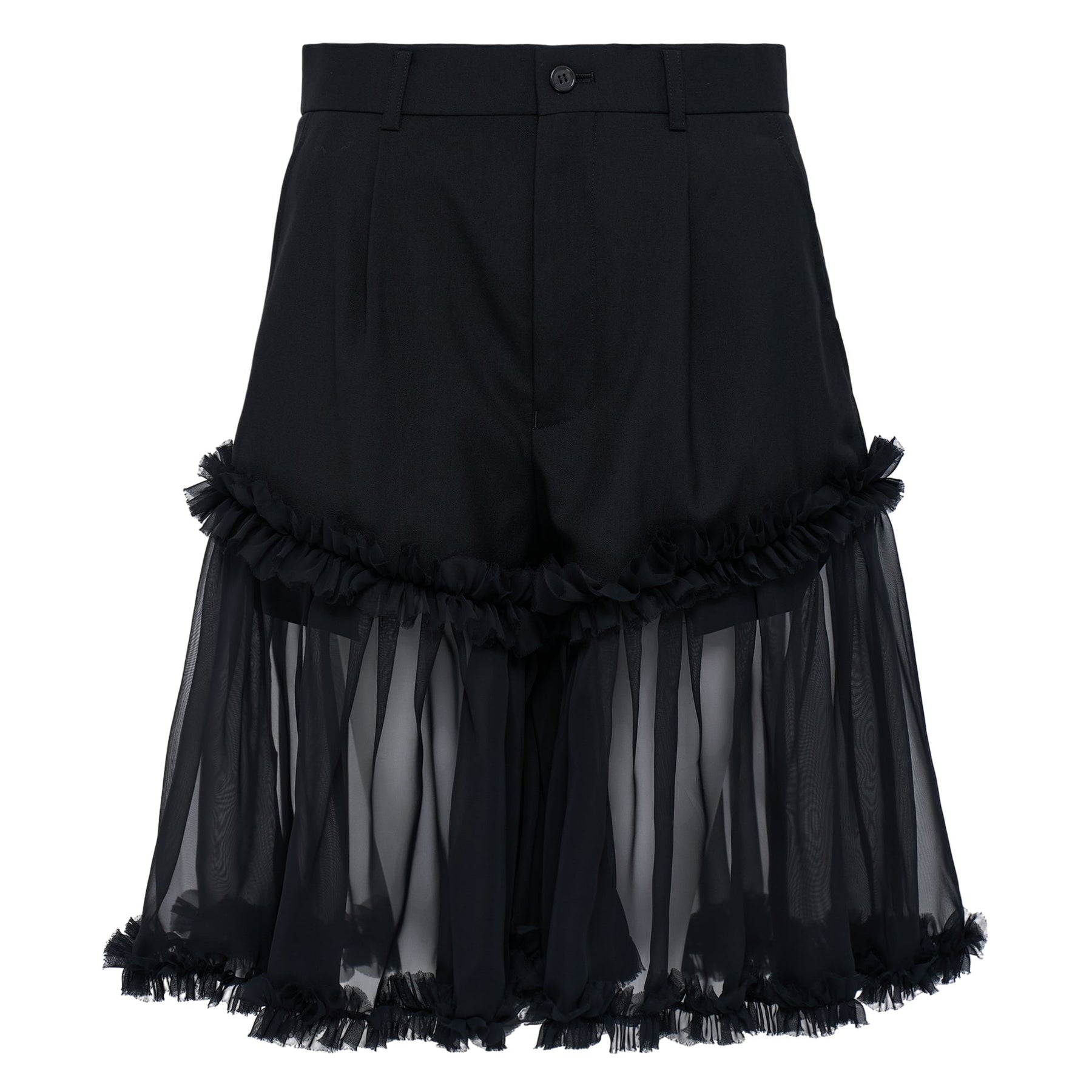 Noir Kei Ninomiya Wool Oxford x Polyester George delivers avant-garde construction with dramatic tulle embellishment and architectural silhouette. Crafted from premium wool oxford blended with polyester for structure and durability, featuring cascading black tulle ruffles that create dynamic movement. The deconstructed design merges formal suiting elements with Rei Kawakubo's protégé's signature experimental approach to feminine form.
