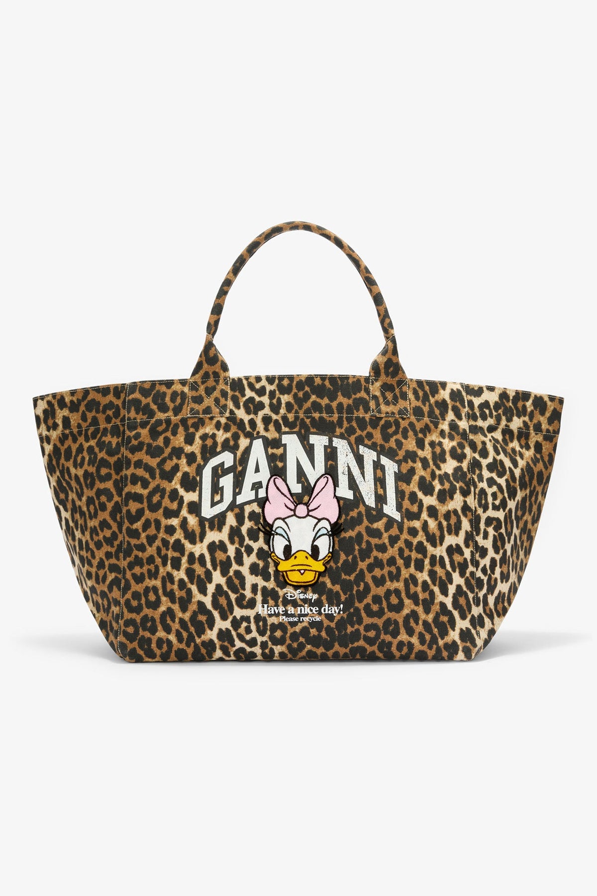 GANNI XXL Trapeze Shopper delivers oversized functionality with bold printed design and spacious interior capacity. Crafted from durable cotton canvas in leopard print, featuring structured trapeze silhouette and comfortable top handles. The playful Daisy Duck graphic and collegiate-style branding create a statement piece for contemporary street style.