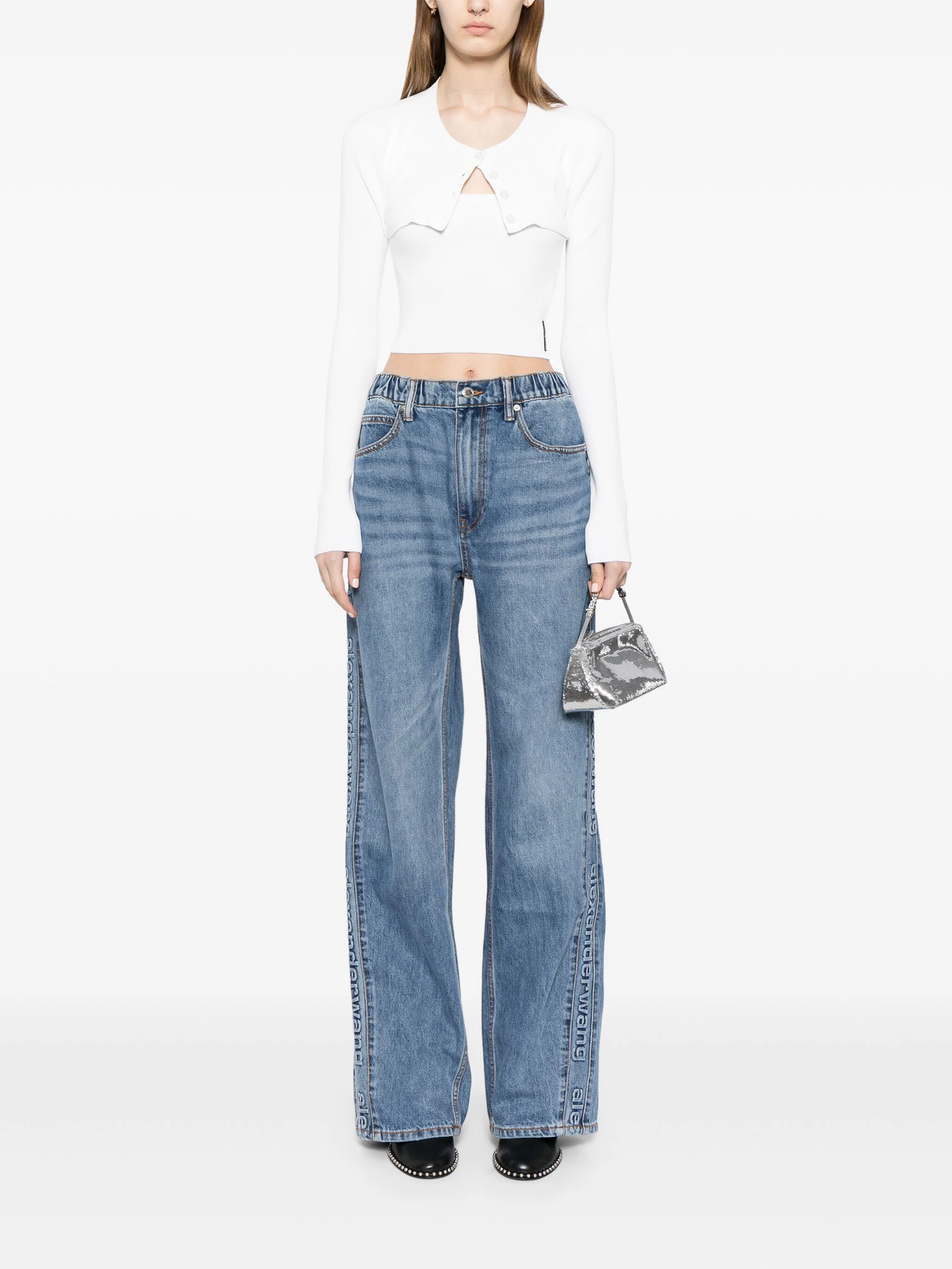 This White twinset flaunts a cropped design, featuring a cami-style bodice fastened by an iridescent buttoned yoke. Its rib-knit construction lends a nuanced textural allure.