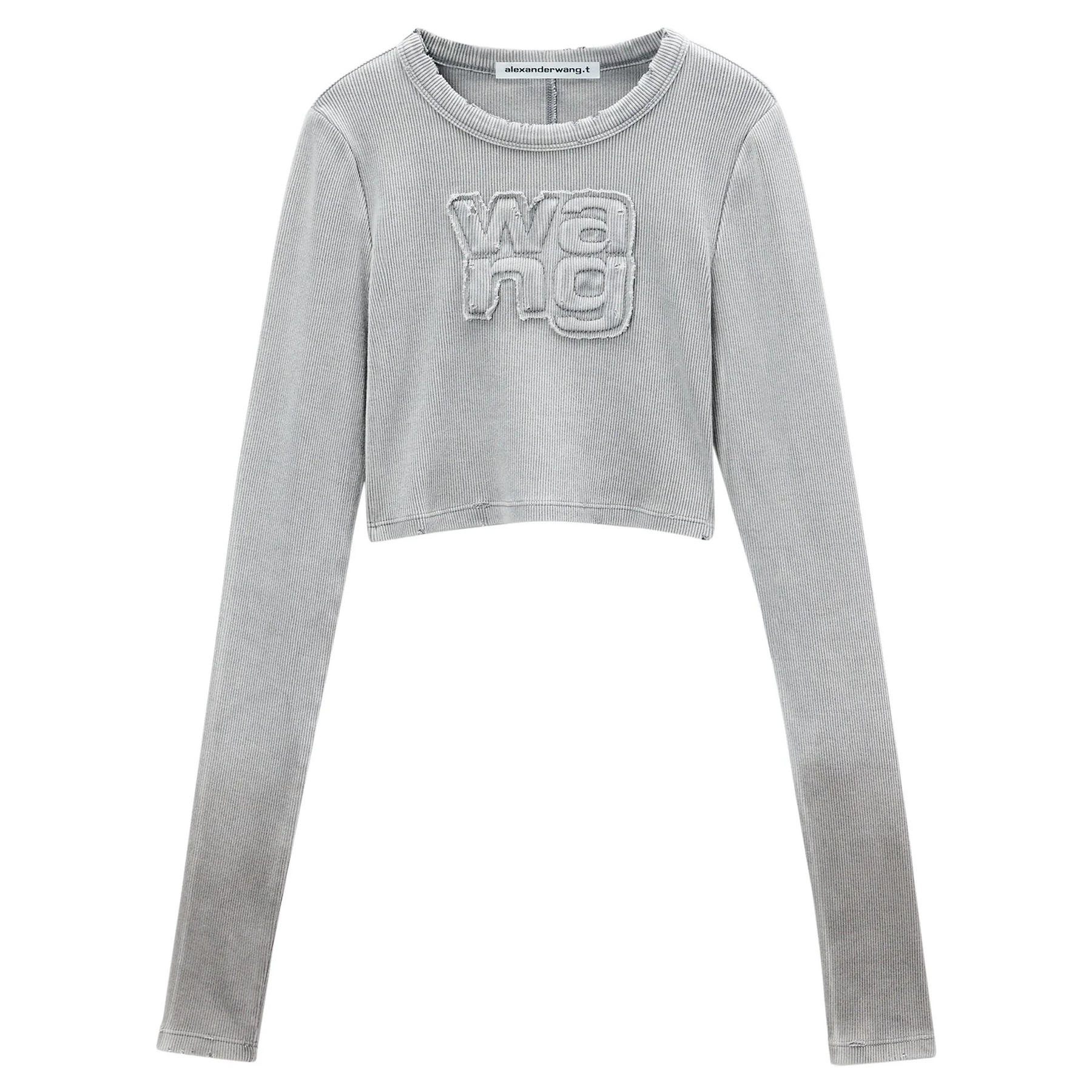 A distressed puffed logo, neckline, and hem define this cropped light grey baby tee. This long-sleeve top is made of a cotton crepe rib blend for super soft comfort.