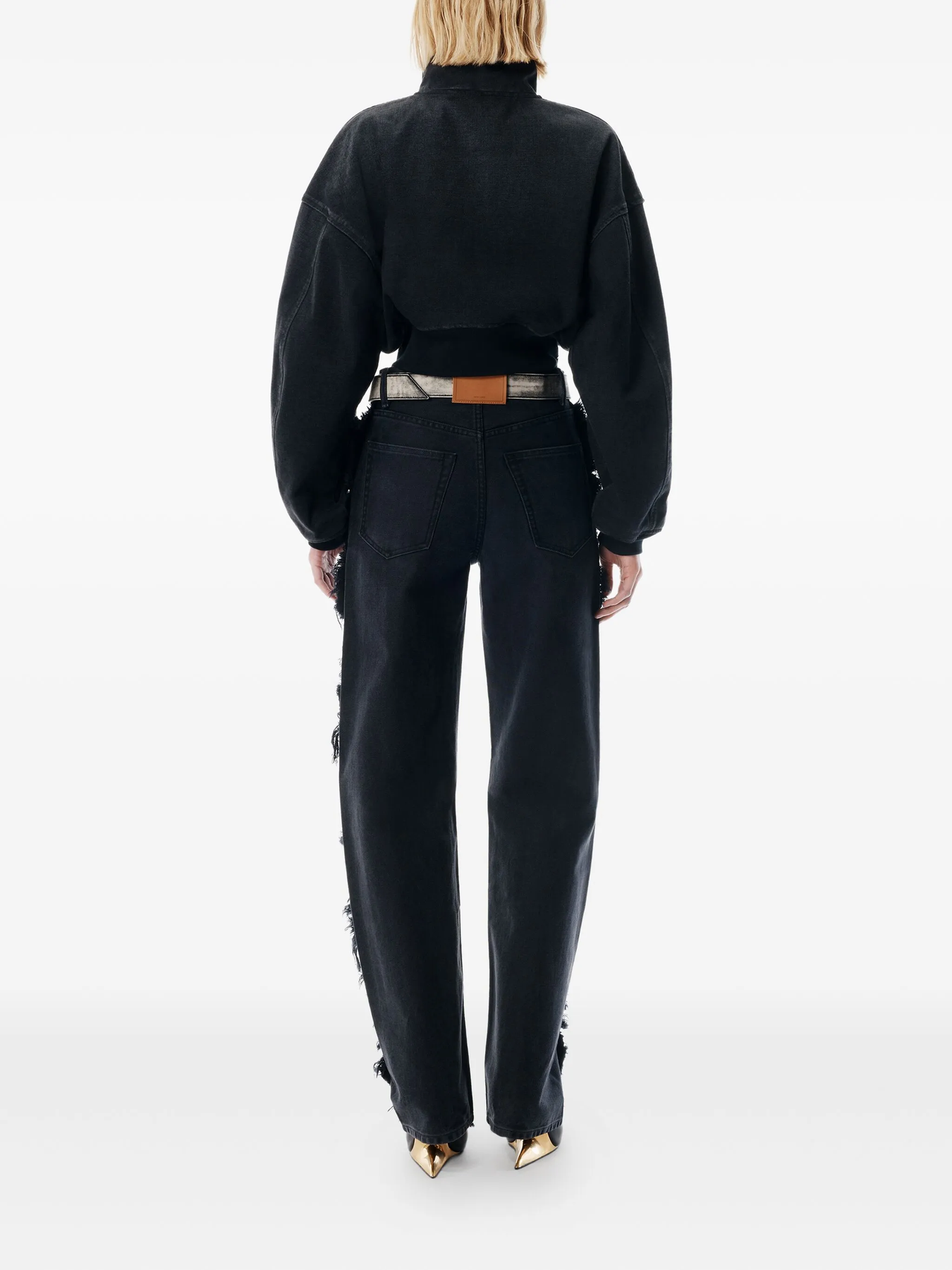 Funnel neck jacket in washed black brushed indigo denim, designed with a dropped shoulder and loose fit. Cropped and cinched at the waist with a tall ribbed hem, it features a zip front closure and a silicone-filled classic logo at the chest.
