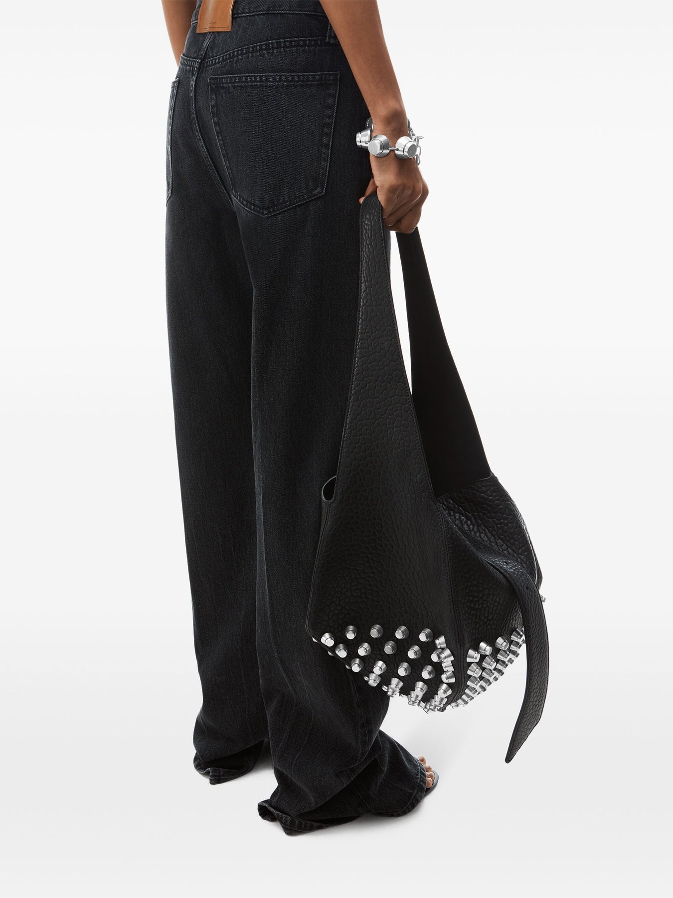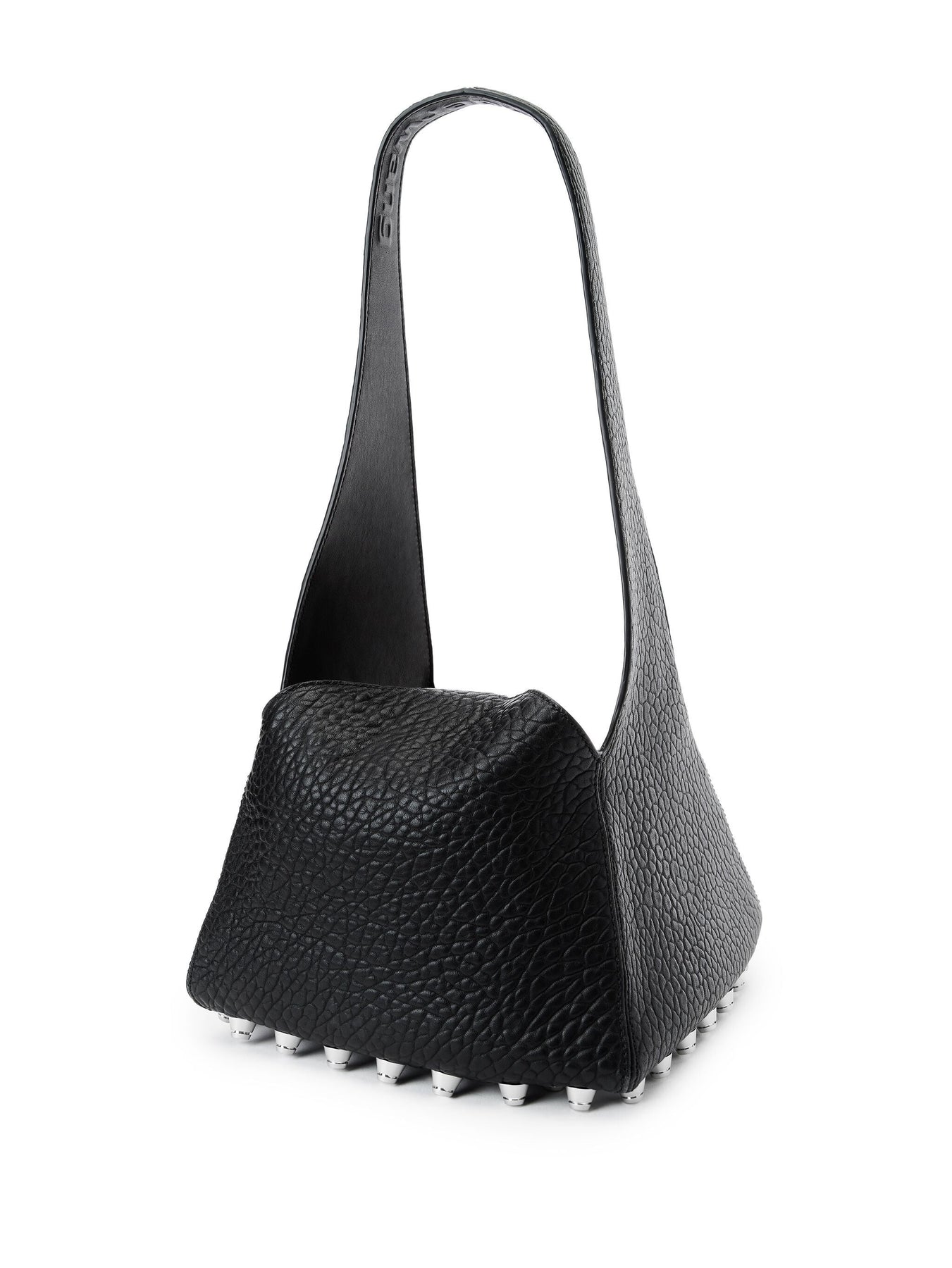 Accentuated by a bottom panel of trap studs, this black leather bag boasts a pyramid silhouette and is made of soft primal lambskin leather. it has a fixed shoulder strap detailed with an engraved roller buckle and is finished with a raised logo under the side.