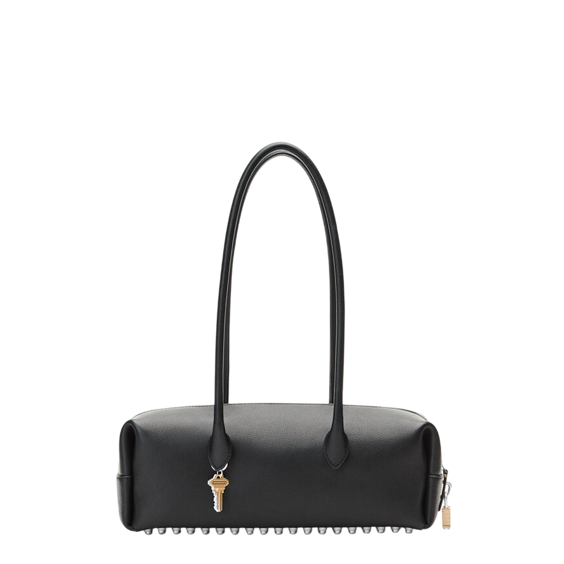 Crafted of black small grain leather, this medium shoulder bag takes inspiration from the iconic ricco bag. A slim rectangle shape features lightweight metal studs at exterior bottom of bag.