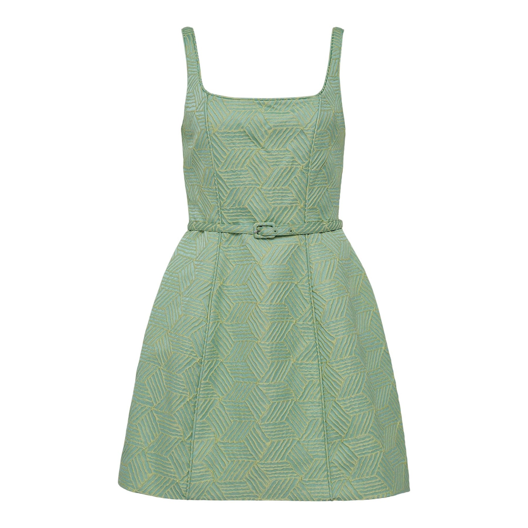 The Bijoux Dress is a textured jacquard mini dress featuring piping accents and a removable belt that cinches the waist.