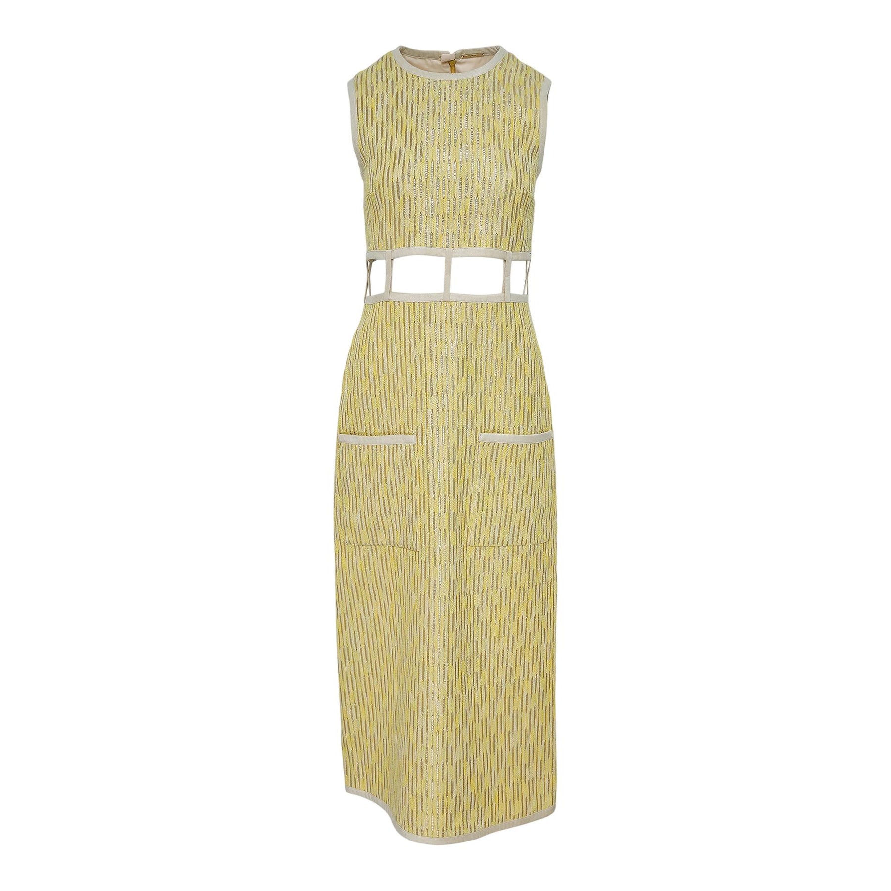 The Renee Dress is a sleeveless, jacquard midi dress with a cut-out detailing at the waist, finished with functional pocket details and subtle shimmer.