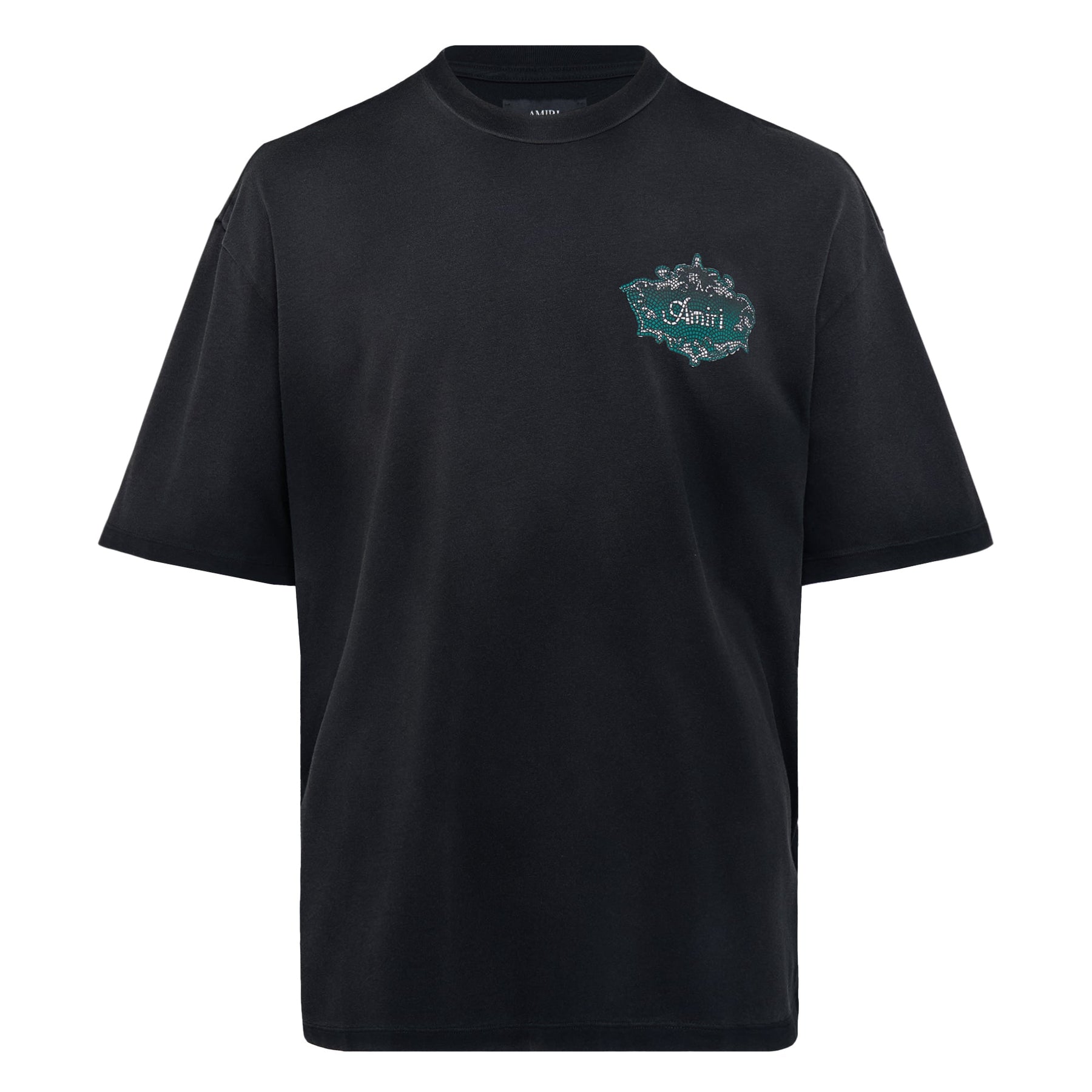 AMIRI Chateau Crest Oversized Tee delivers luxury streetwear with signature crystal embellishment and relaxed silhouette. Crafted from premium cotton jersey in rich black, featuring an intricate crystal-detailed crest logo on the chest. The oversized fit and artisanal embellishment showcase AMIRI's commitment to elevated casual wear.