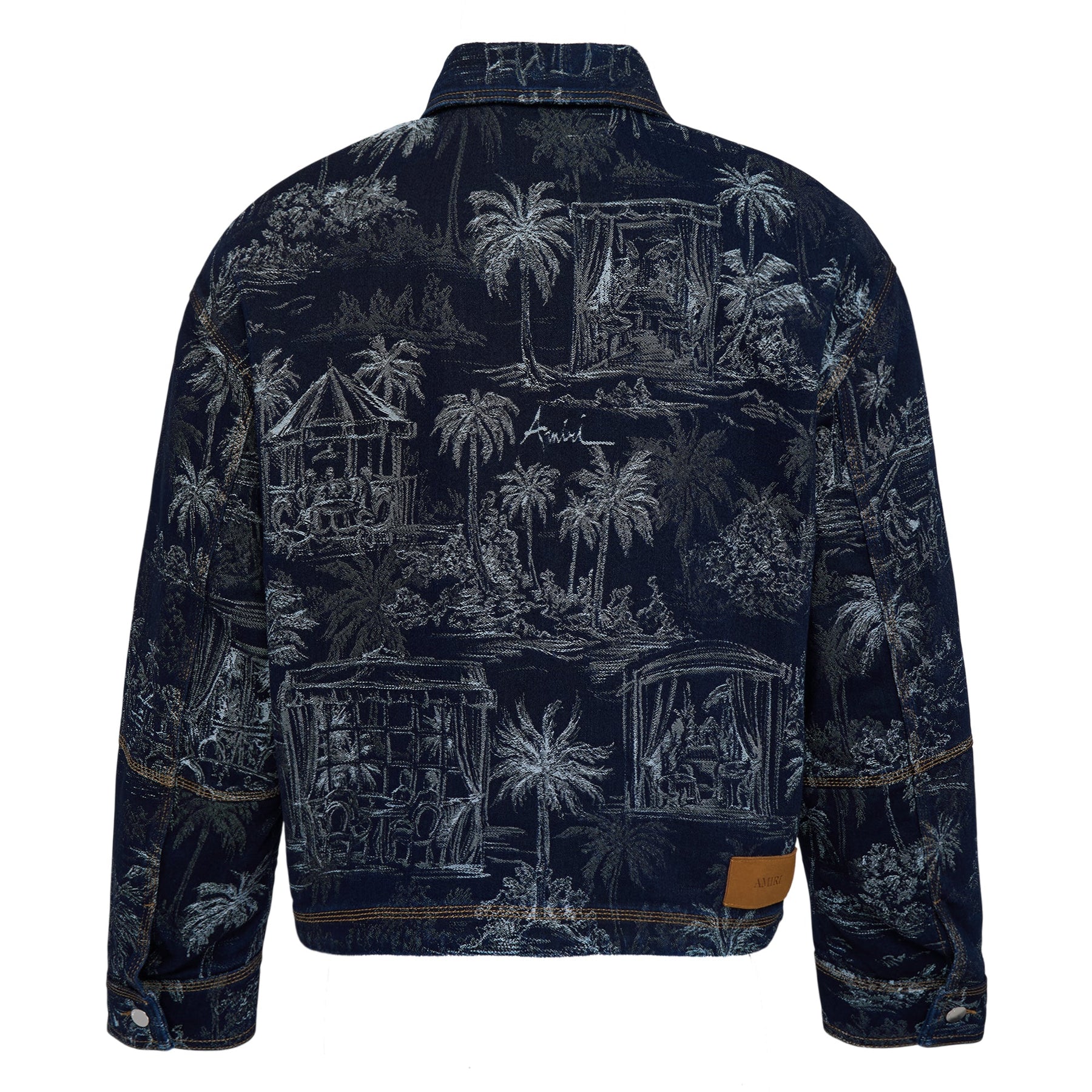 AMIRI Chateau Palms Jacquard Jacket delivers luxury streetwear with intricate tropical artistry and premium construction. Crafted from jacquard denim featuring all-over palm tree motifs in tonal navy, with signature contrast stitching and zip closure detailing. The structured silhouette and signature AMIRI craftsmanship create a statement piece for contemporary luxury wardrobes.