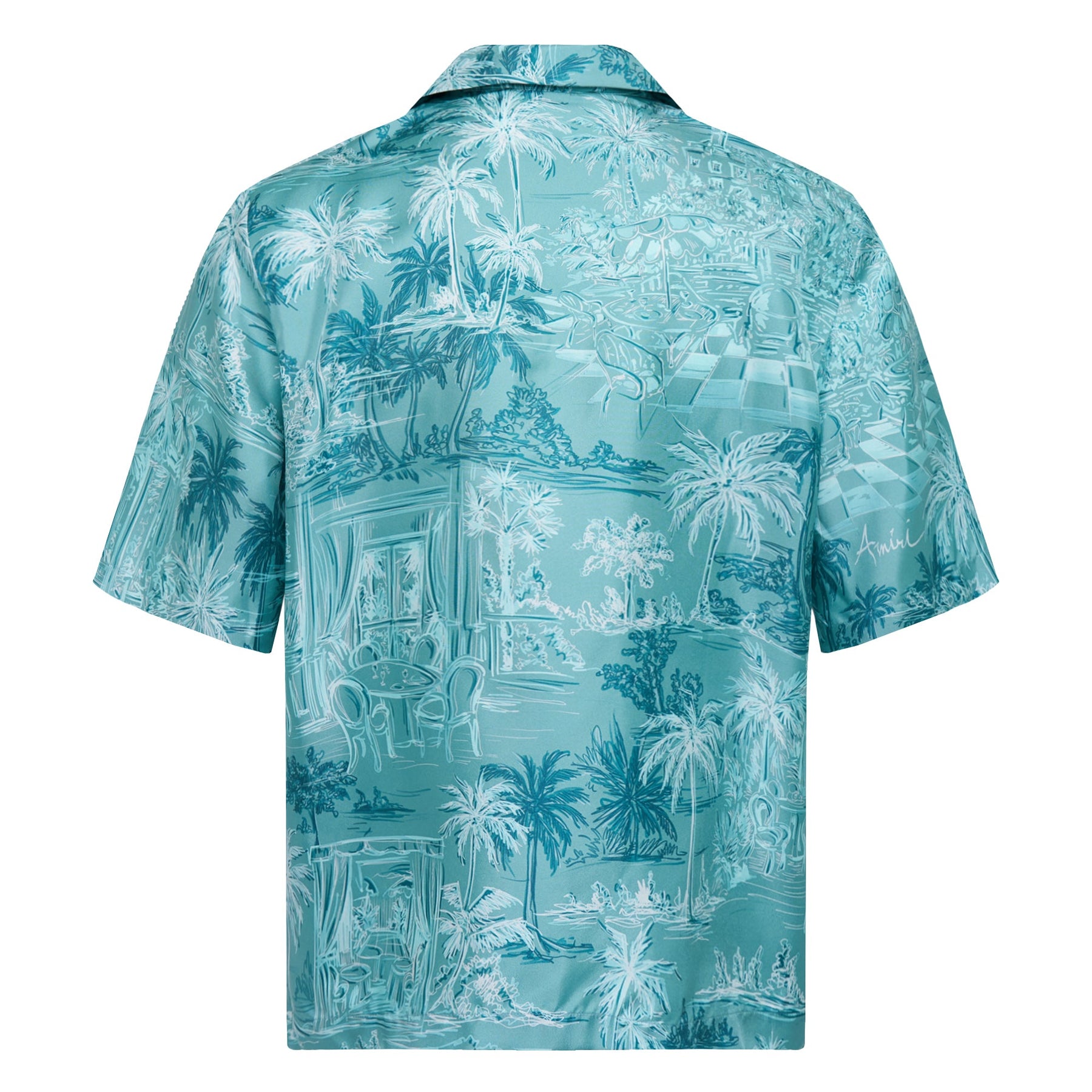 AMIRI Chateau Sketch Bowling Shirt delivers luxury streetwear with artistic tropical-inspired graphics and relaxed sophistication. Crafted from premium lightweight fabric in aqua blue, featuring an all-over tropical scene print with palm trees and architectural sketches. The classic bowling shirt silhouette with camp collar creates a refined vacation aesthetic perfect for elevated casual styling.