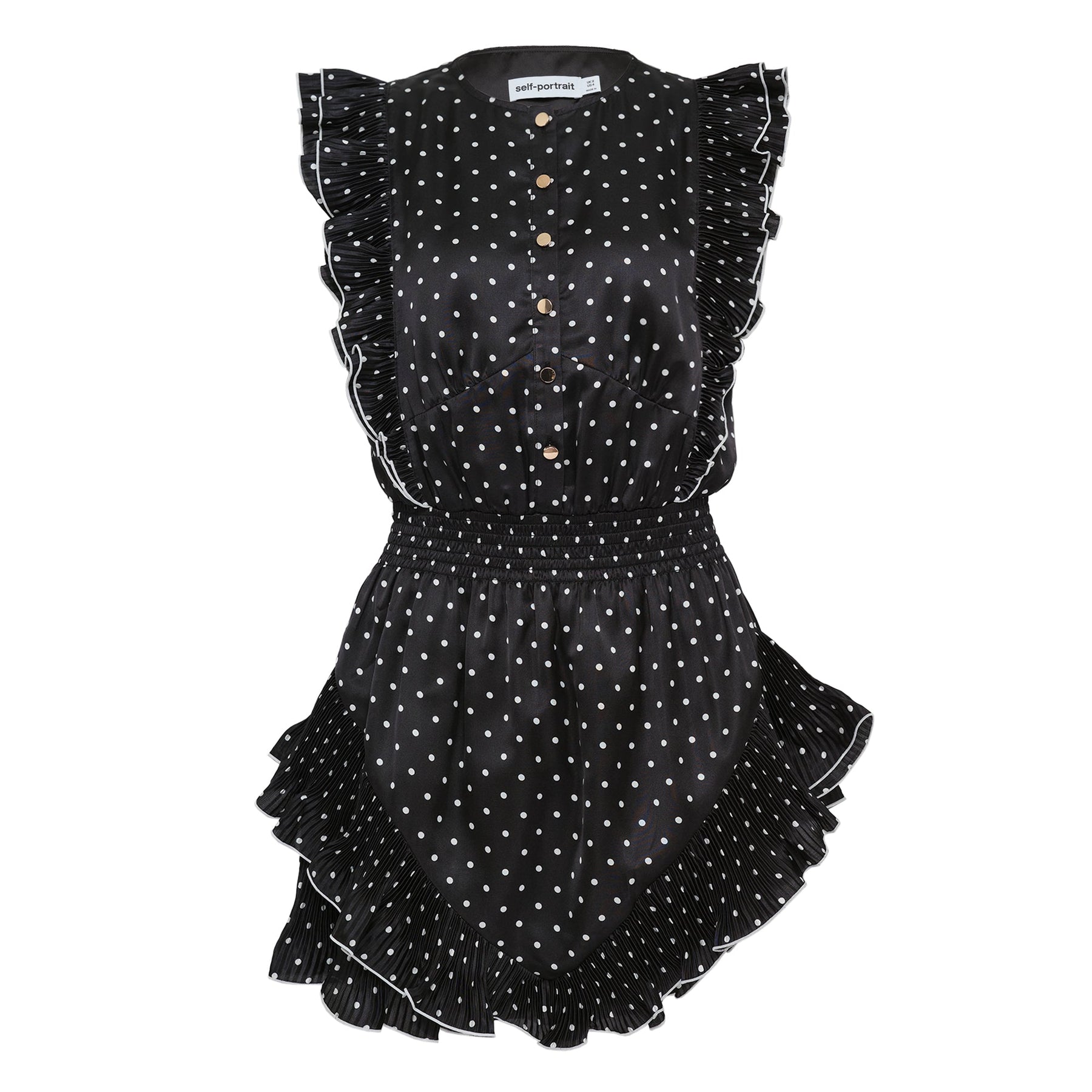 Self-Portrait Black Polka Dot Frill Mini Dress delivers feminine elegance with romantic detailing and contemporary sophistication. Crafted from premium woven fabric in classic black with white polka dots, featuring cascading tiered ruffles and gathered sleeves. The fitted waist and playful frills create the brand's signature blend of vintage charm and modern glamour.