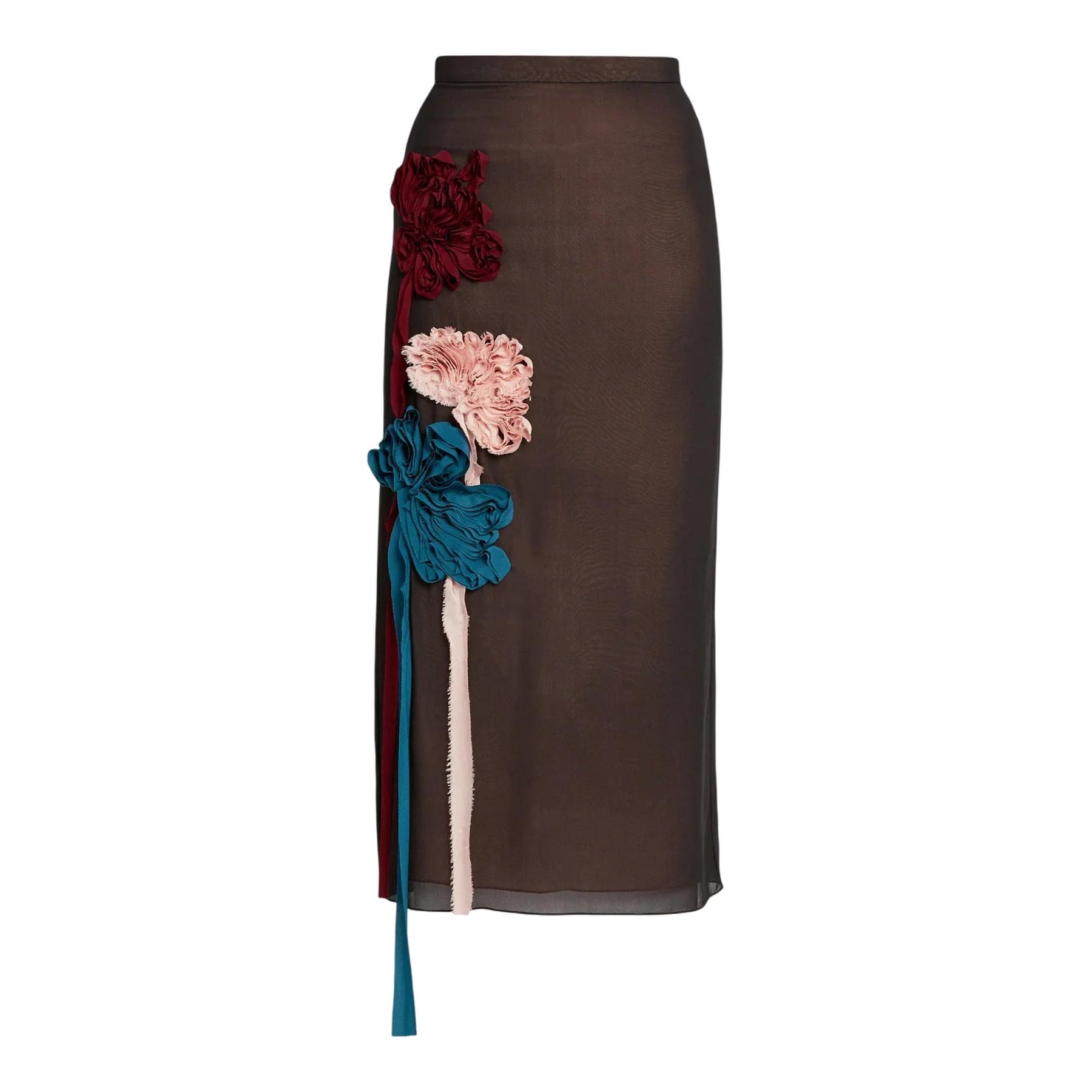 This pencil skirt is cut from brown silk georgette. It is embellished with three flowers, each depicted using trailing ribbon.