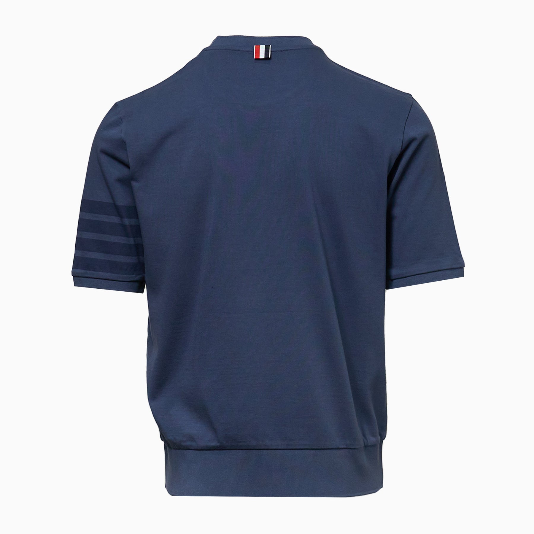 Thom Browne Garment Dyed Short Sleeve Rib Top delivers elevated casual luxury with signature tailoring details. Crafted from premium cotton in deep navy with garment-dyed finish for lived-in texture and rich color depth. The structured ribbed construction and signature four-bar stripes create an unmistakably refined streetwear piece.