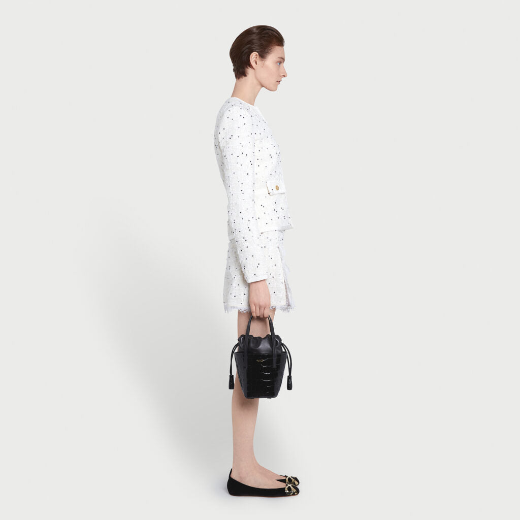 This ivory jacket with black polka dots in bouclé features two fake pockets adorned with gold buttons.