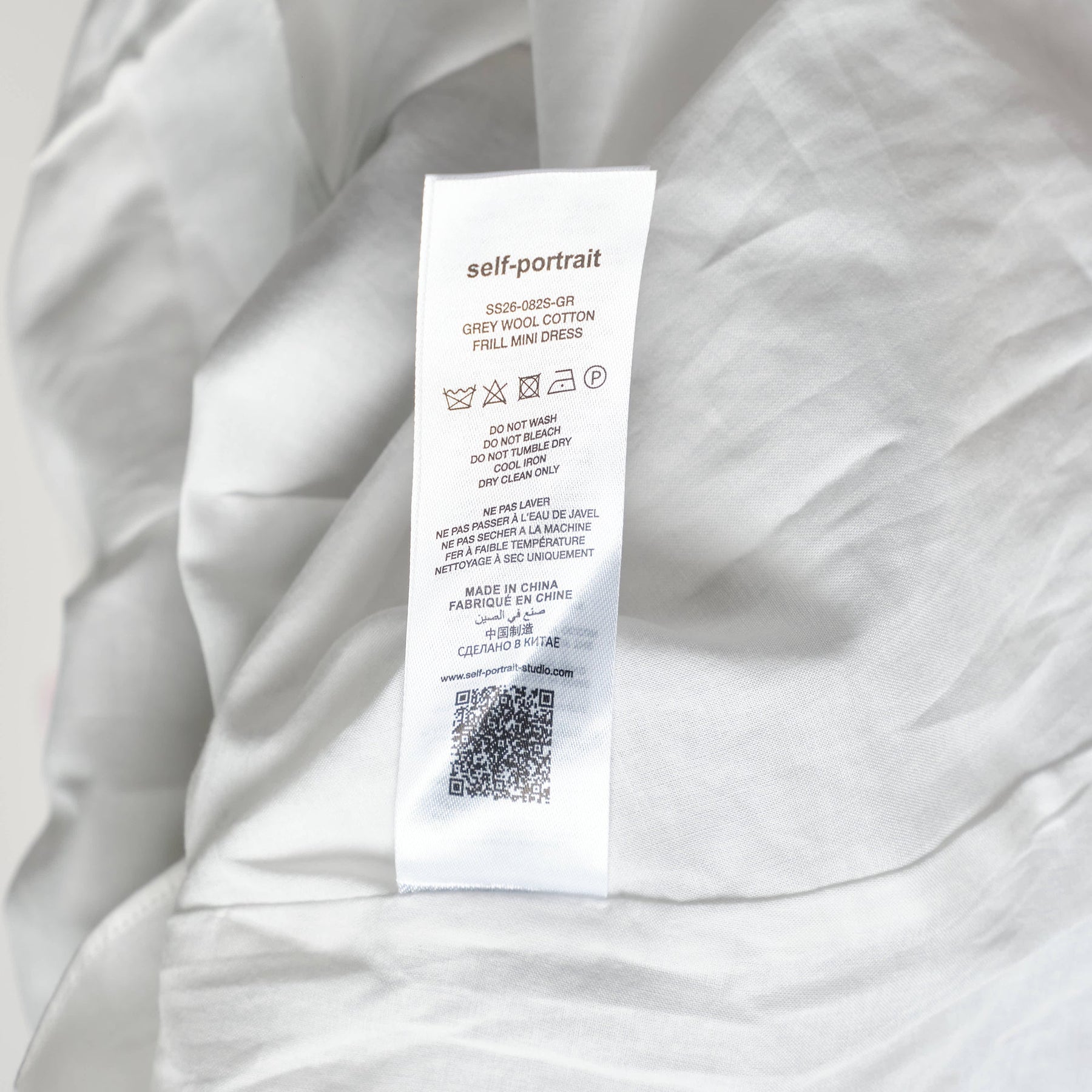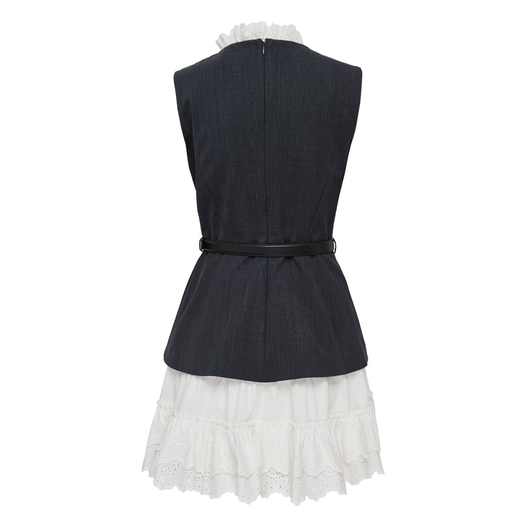Self-Portrait Grey Wool Cotton Frill Mini Dress delivers contemporary femininity with structured tailoring and romantic detailing. Crafted from premium wool-cotton blend in charcoal grey, featuring white lace trim collar and tiered eyelet cotton skirt overlay. The sleeveless silhouette with button-front closure and coordinating belt creates a sophisticated contrast between minimalist and romantic aesthetics.