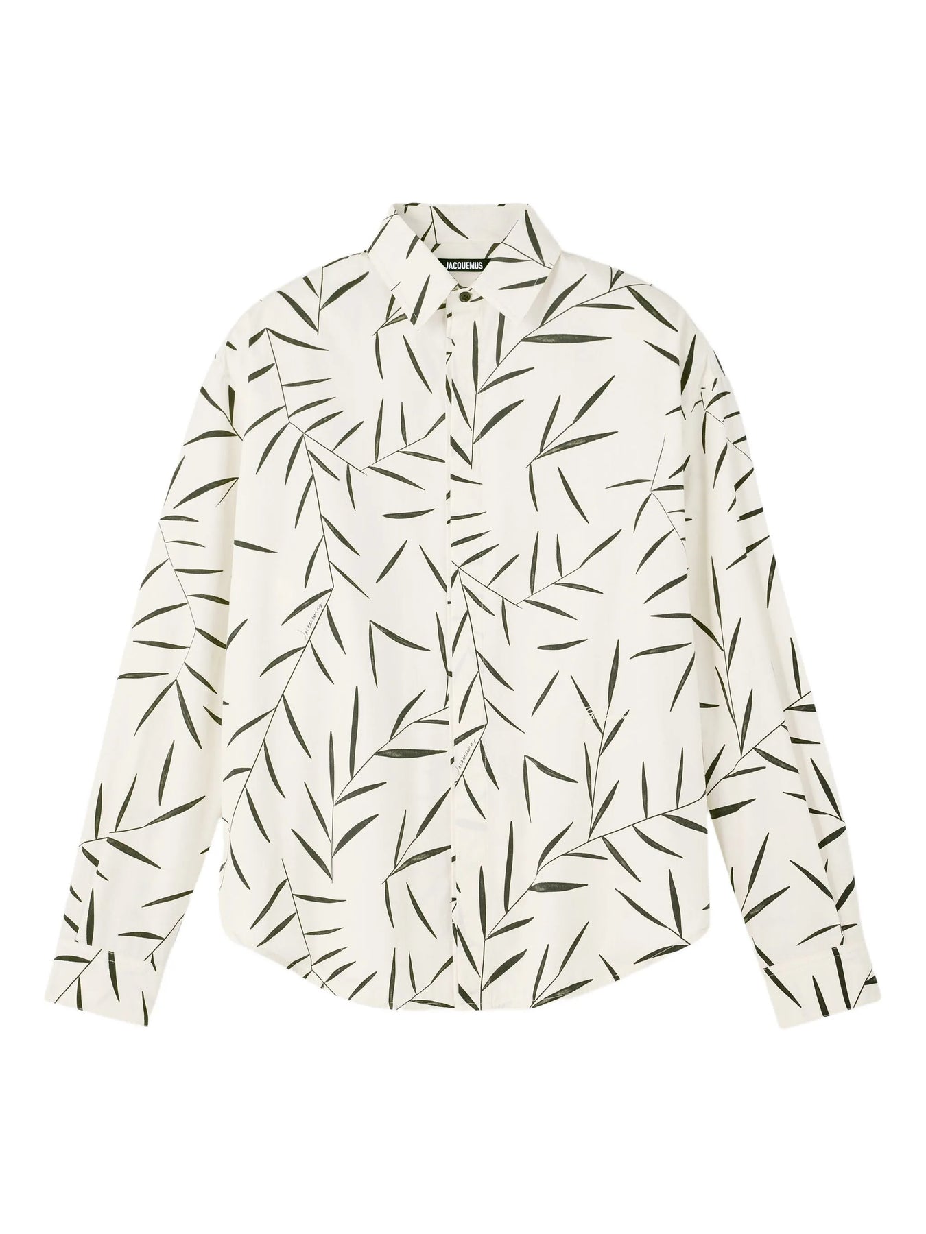 JACQUEMUS La Chemise Simon Long Sleeve Shirt delivers French minimalism with botanical-inspired elegance and sophisticated tailoring. Crafted from lightweight cotton in cream with olive green leaf print, featuring the brand's signature clean lines and relaxed silhouette. The contemporary botanical motif and refined construction create a versatile piece that embodies JACQUEMUS' modern Provence aesthetic.