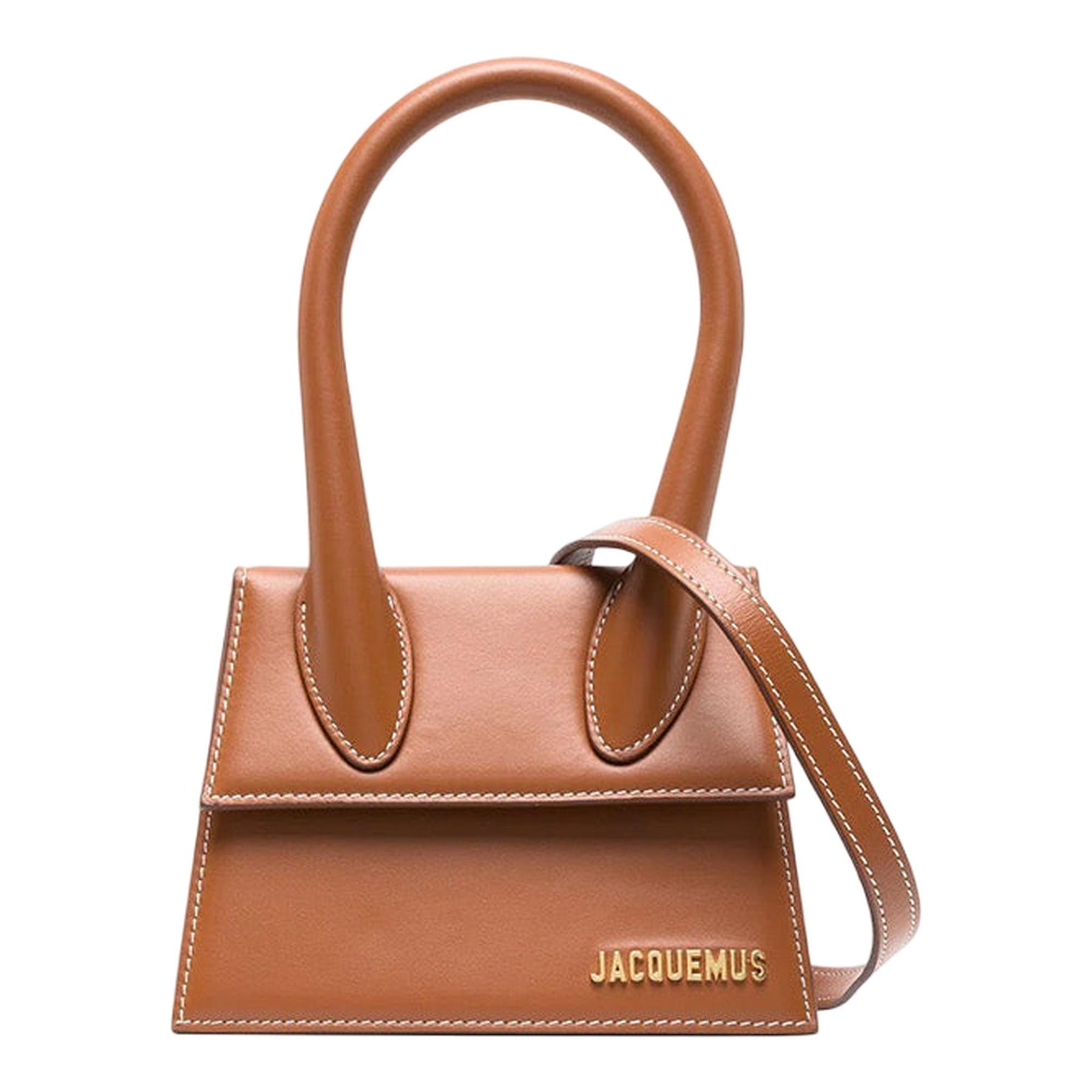 JACQUEMUS 將其標誌性的 Le Chiquito 包袋更新為淺棕色。這款款式採用結構化梯形廓形設計,正面飾有品牌金色徽標字樣。