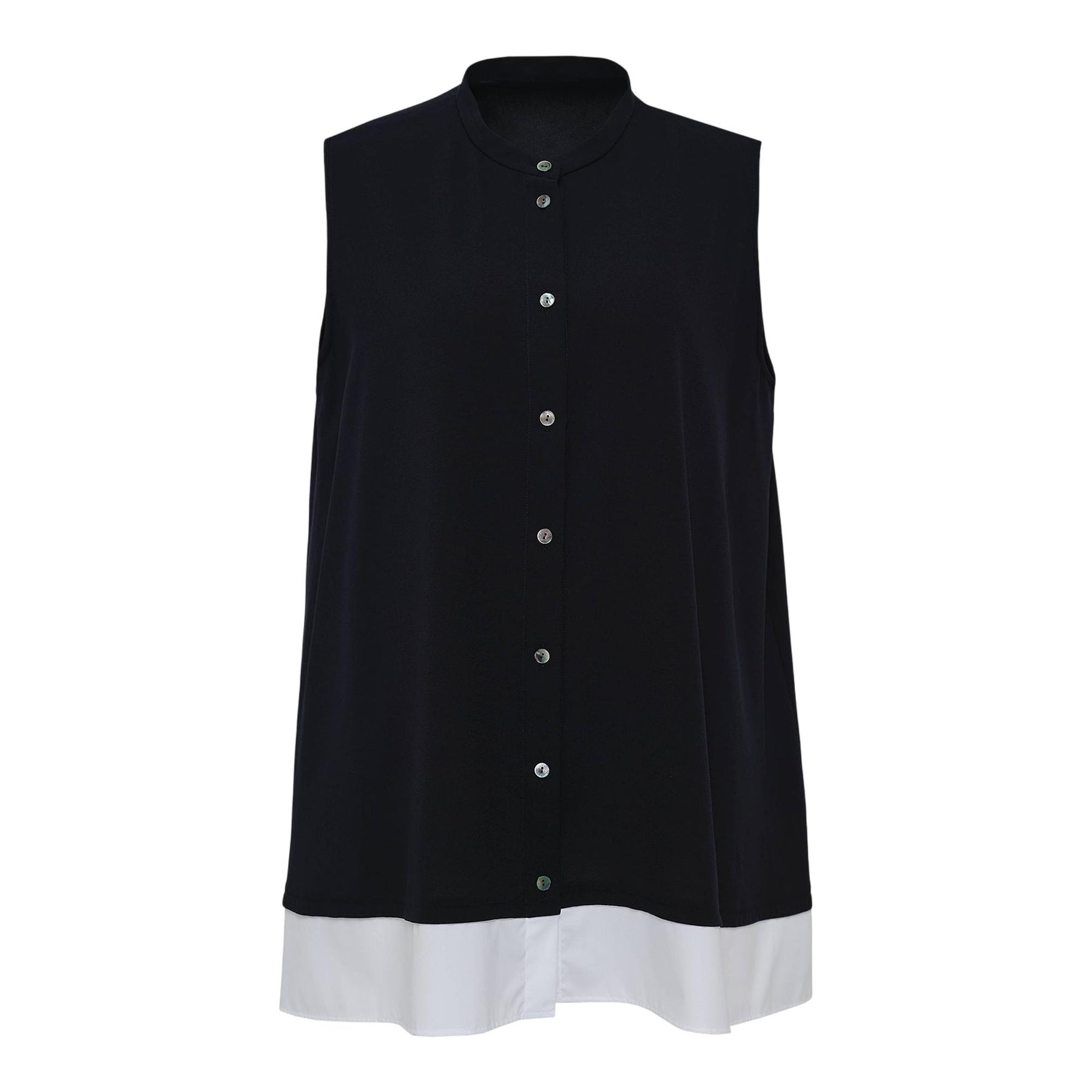ENFOLD Layered A-Line Tank Top delivers contemporary minimalism with sophisticated architectural layering. Crafted from premium cotton blend in sleek black with contrasting white hem detail, creating visual depth through structured design. The brand's signature clean aesthetic and innovative layering technique elevates casual wear with modern sophistication.