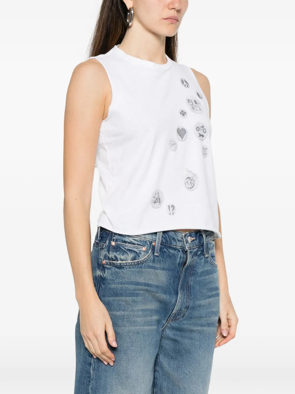 The MOTHER Lil Goodie Goodie Chop Tank delivers effortless California cool with playful vintage-inspired graphics. Crafted from soft cotton jersey in crisp white, featuring an array of eclectic patch graphics including peace signs, hearts, and whimsical motifs. The relaxed sleeveless silhouette and MOTHER's signature irreverent aesthetic create the perfect laid-back statement piece.