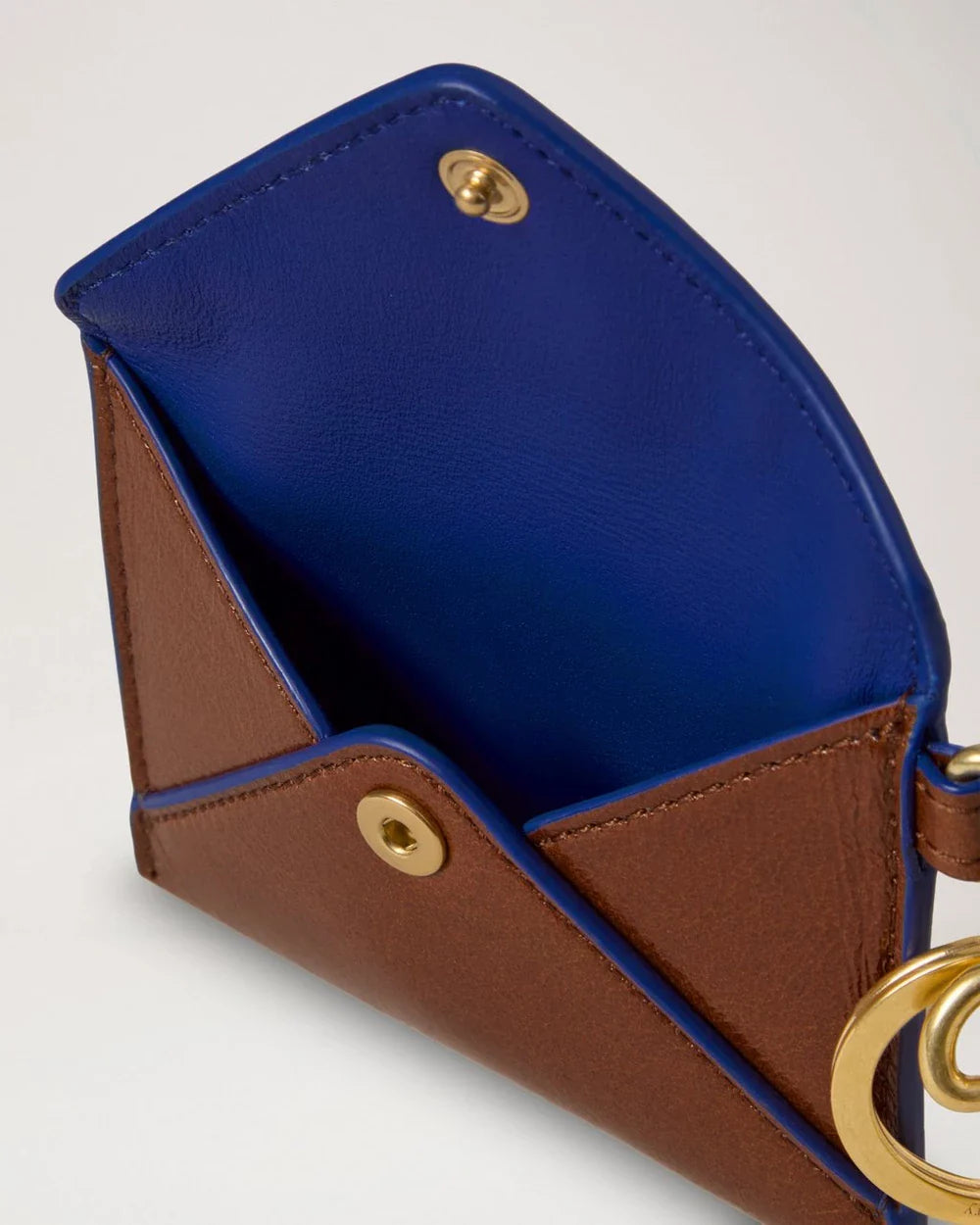 The Mulberry Love Letter Card Slip Keyring combines functional card storage with signature luxury craftsmanship. Crafted from premium smooth leather in cognac brown with contrasting navy blue edge stitching, featuring the brand's iconic envelope-inspired design. The polished gold-tone hardware and snap closure deliver both security and sophisticated style for everyday essentials.