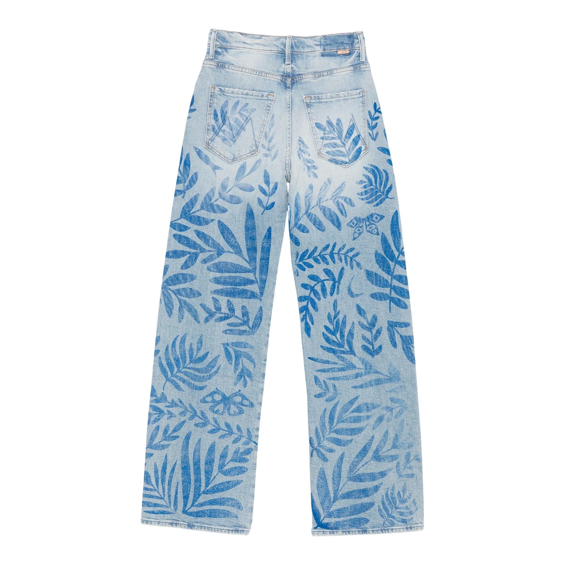 Leaf it to me. Wide-leg pants with a high rise and a 32-inch inseam with a clean hem. Made from semi-rigid SUPERIOR denim, Pressed Leaves is a light blue with subtle whiskering, fading at the knees and a blue leaf graphic stamped throughout.