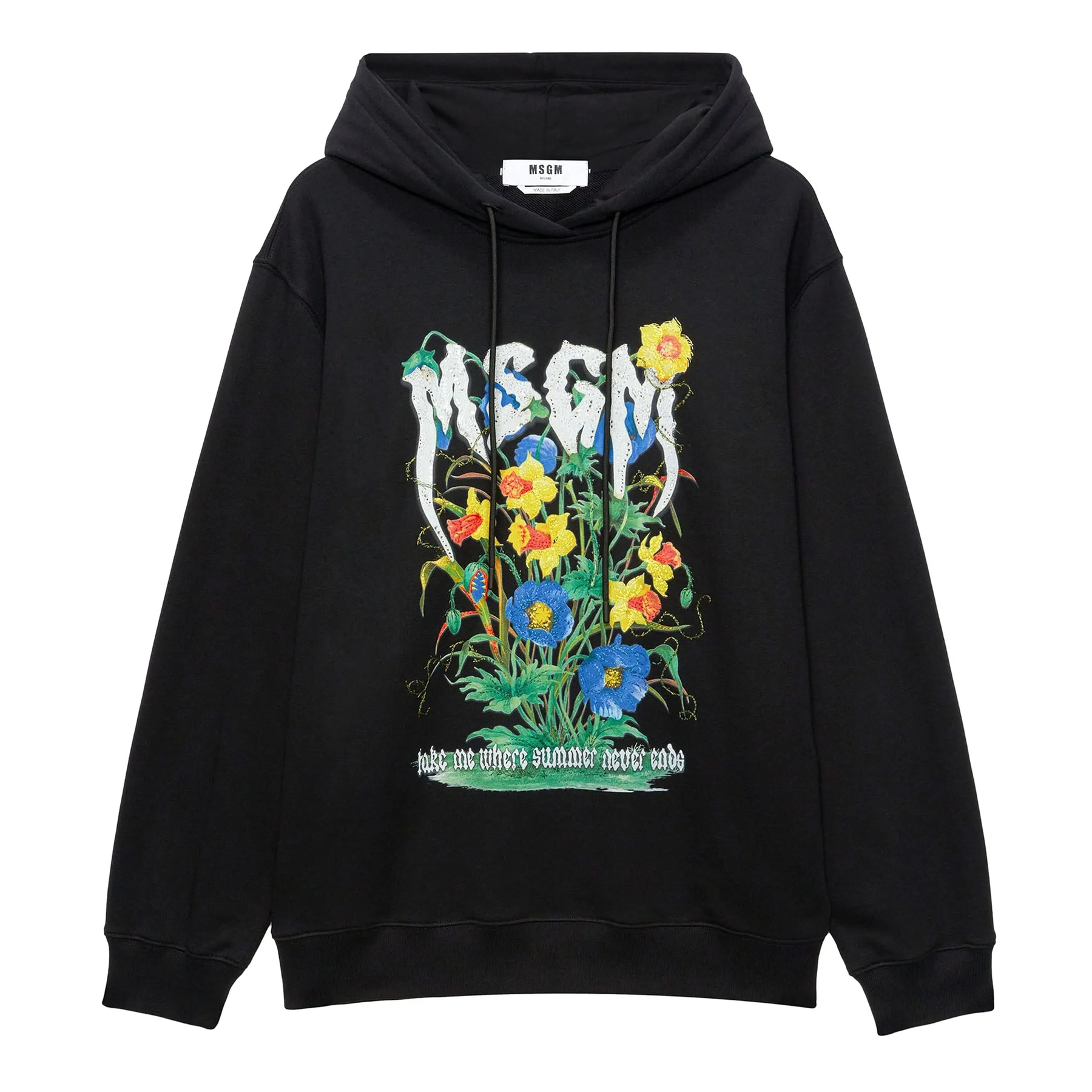 MSGM's signature hoodie delivers contemporary Italian streetwear with bold graphic impact and premium comfort. Crafted from heavyweight cotton fleece in classic black, featuring vibrant floral artwork and gothic-inspired typography. The oversized fit and distinctive MSGM aesthetic create an effortless statement piece for modern casual wardrobes.