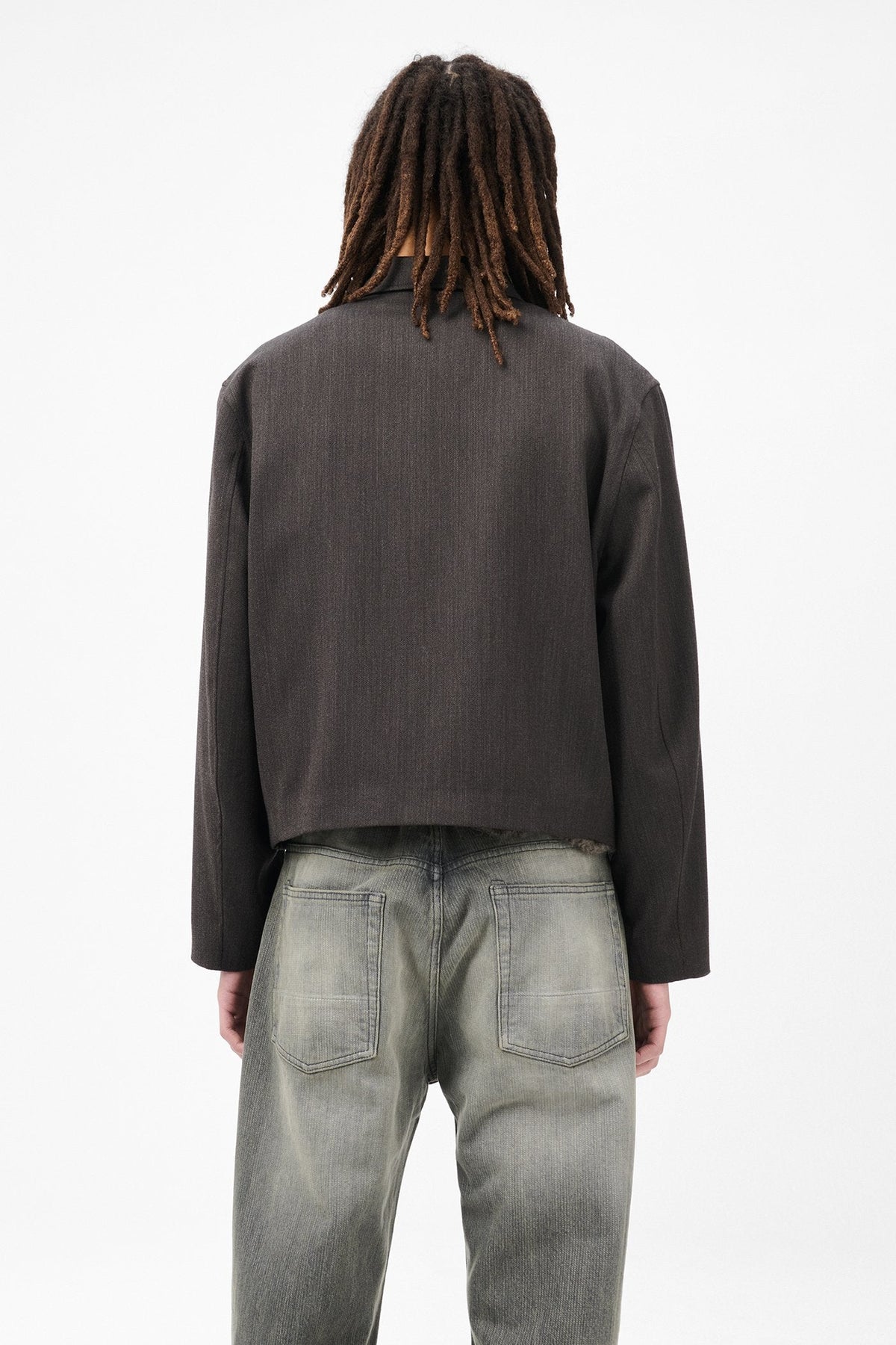 Our Mini Jacket in Havana Brown Chain Wool. Produced in Italian suiting fabric made from virgin wool, the men's Mini Jacket has a minimalist, boxy fit and features full lining, a RiRi two way zip and jet front pockets.