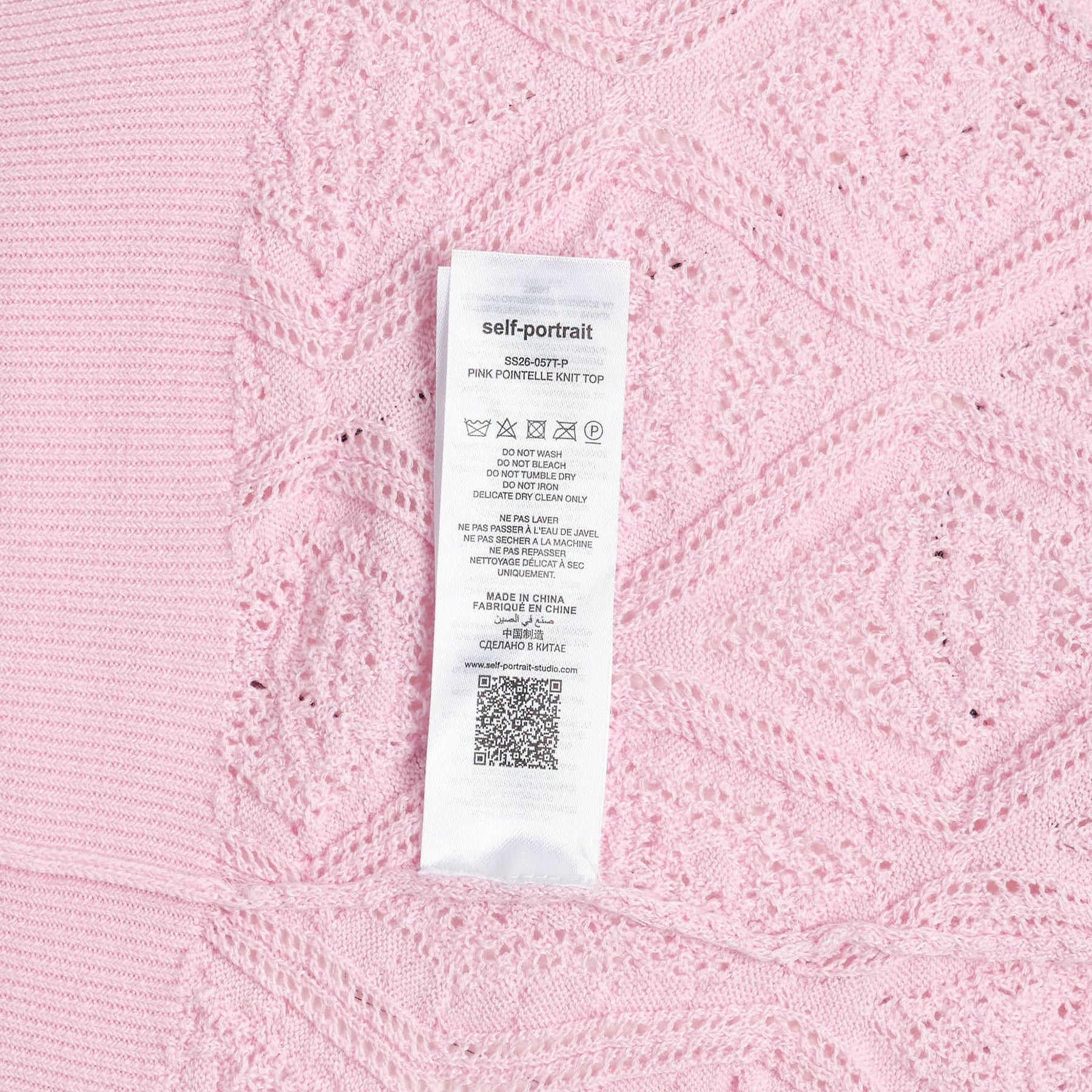 Self-Portrait Pink Pointelle Knit Top delivers feminine elegance with intricate cable-knit construction and delicate pointelle detailing. Crafted from soft pink cotton-blend yarn featuring diamond cable patterns and eyelet perforations throughout. The cropped cardigan silhouette with embroidered logo patch creates a romantic statement piece for contemporary styling.